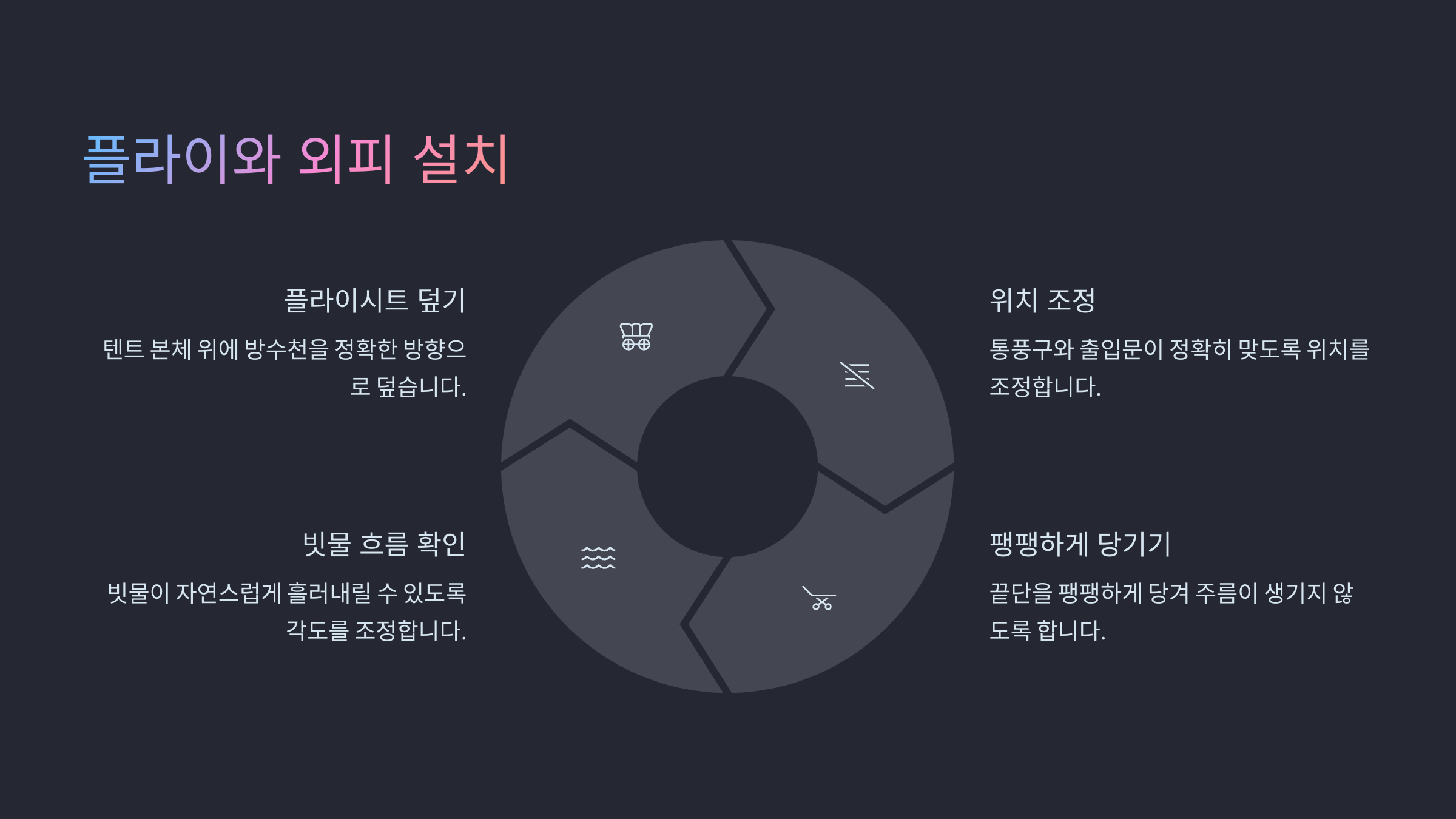 항목 좋은 설치 잘못된 설치 정렬 출입문 위치 일치 뒤집혀 설치됨 간격 공기 순환 공간 확보 밀착으로 결로 발생 고정 모서리 클립 연결 느슨하거나 누락 스트링 각도 45도 방향으로 팽팽하게 각도 너무 급함 환기구 활용 활짝 열어두기 닫혀 결로 생김 이제 외부 보호막까지 완벽하게 설치했어요. 마무리 단계에서는 팩 고정과 텐트 주변 정리를 통해 전체를 견고하게 마무리해야 해요. 🔧 다음은 팩 고정과 마무리 정리 과정이에요!