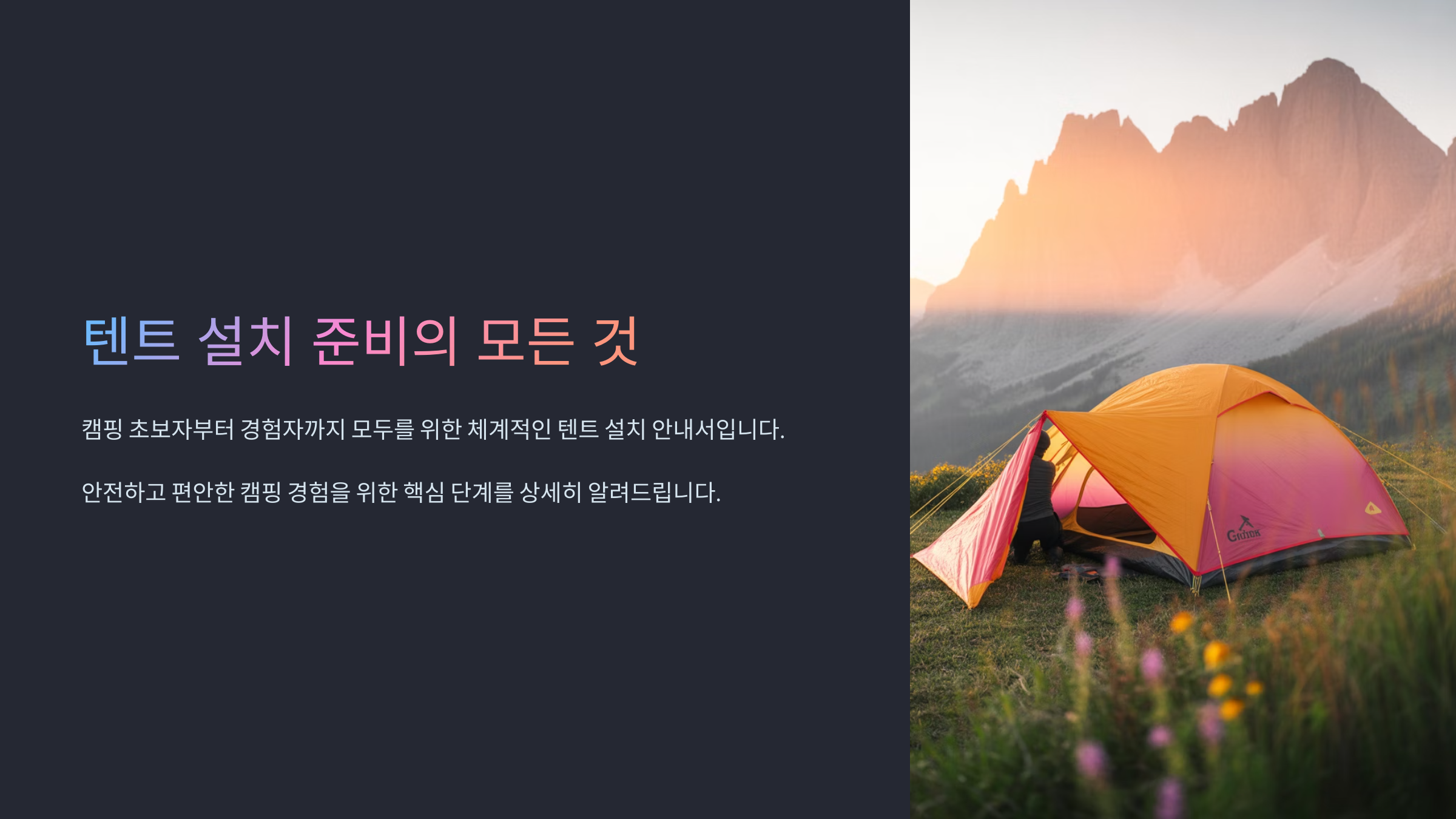 텐트를 편하게 설치하면 캠핑이 한결 즐거워지고, 설치 시간을 줄이면 다른 즐거움에 더 집중할 수 있어요. ‘내가 생각했을 때’ 텐트 설치는 캠핑의 절반이에요. 실패 없는 캠핑을 위한 텐트 설치 순서를 지금부터 차근차근 알려줄게요! 🤗
