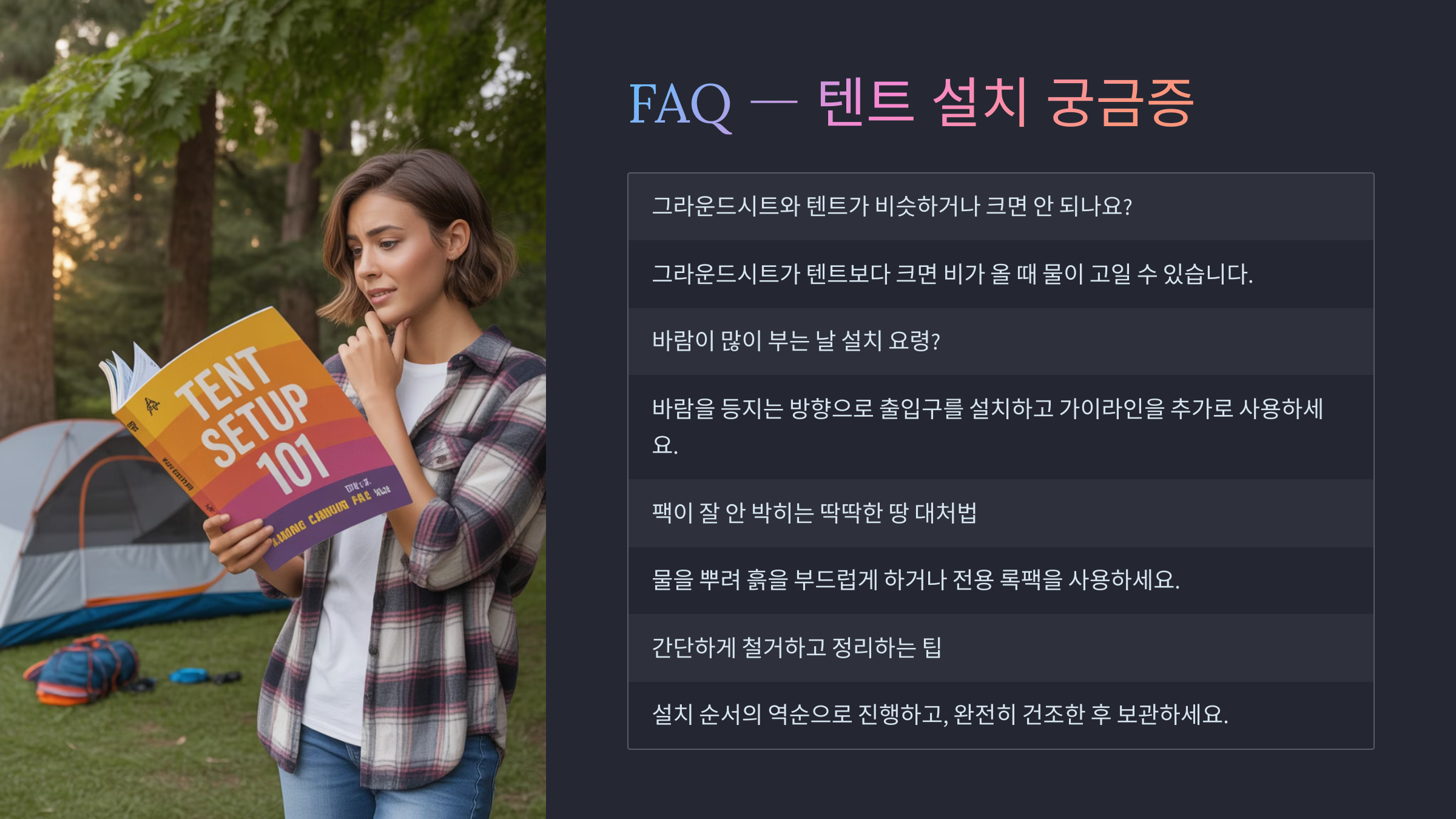 항목 올바른 방법 주의할 점 각도 땅과 60도 기울임 수직 설치 피하기 깊이 절반 이상 박힘 헐렁하면 재설치 도구 전용 망치 사용 맨손 사용 금지 표시 야광끈 부착 넘어짐 위험 정리 주변 로프 정돈 로프 방치 이제 텐트 설치가 모두 끝났어요! 🎉 진짜 캠핑의 시작이에요. 다음은 많이 궁금해하시는 질문들을 모은 FAQ로 마무리해볼게요!
