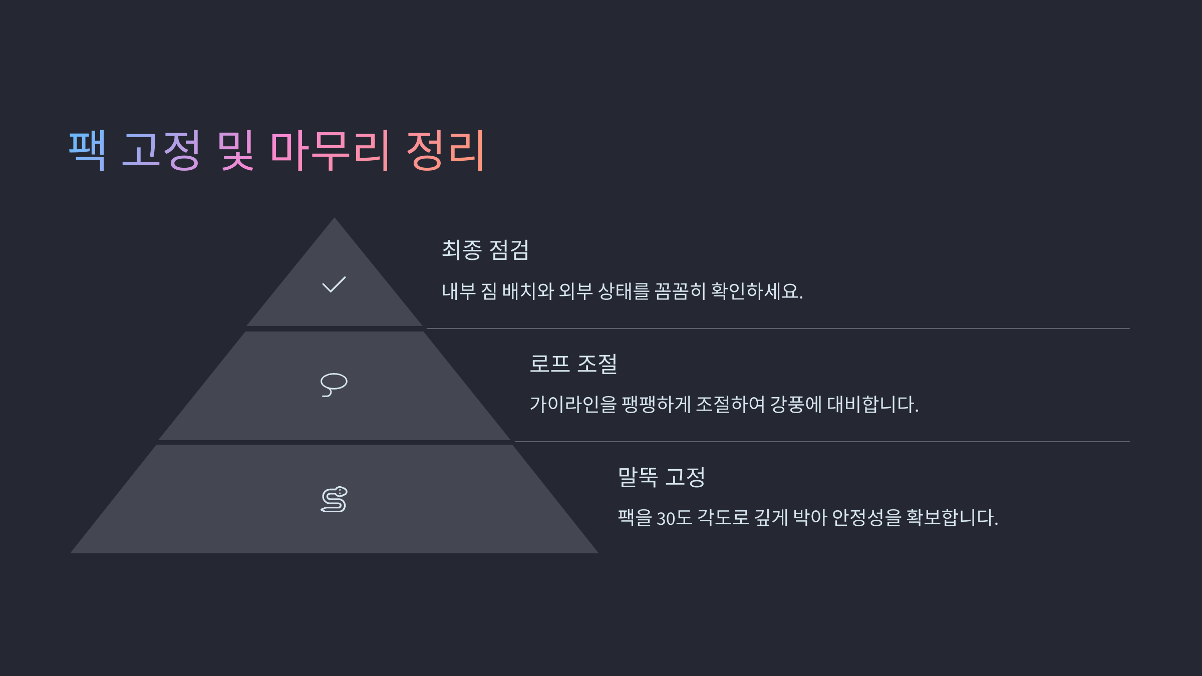 마지막으로 스트링(로프)을 활용해 팩에 고정하면 바람에 강한 텐트가 완성돼요. 로프는 땅과 45도 각도로 당겨주는 게 가장 튼튼하고, 팩은 땅에 깊숙이 박아줘야 효과가 커요. 각도와 방향에 따라 안정감이 달라진답니다!