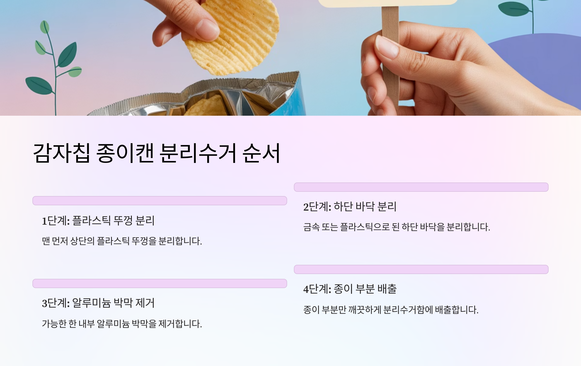 지금부터 감자칩 종이캔 분리수거에 대해 제대로 알아보는 시간을 가져볼게요. 이 글은 3개의 박스로 나누어 순서대로 자동 출력될 거예요. 다음 박스에서 계속 이어집니다 🔄