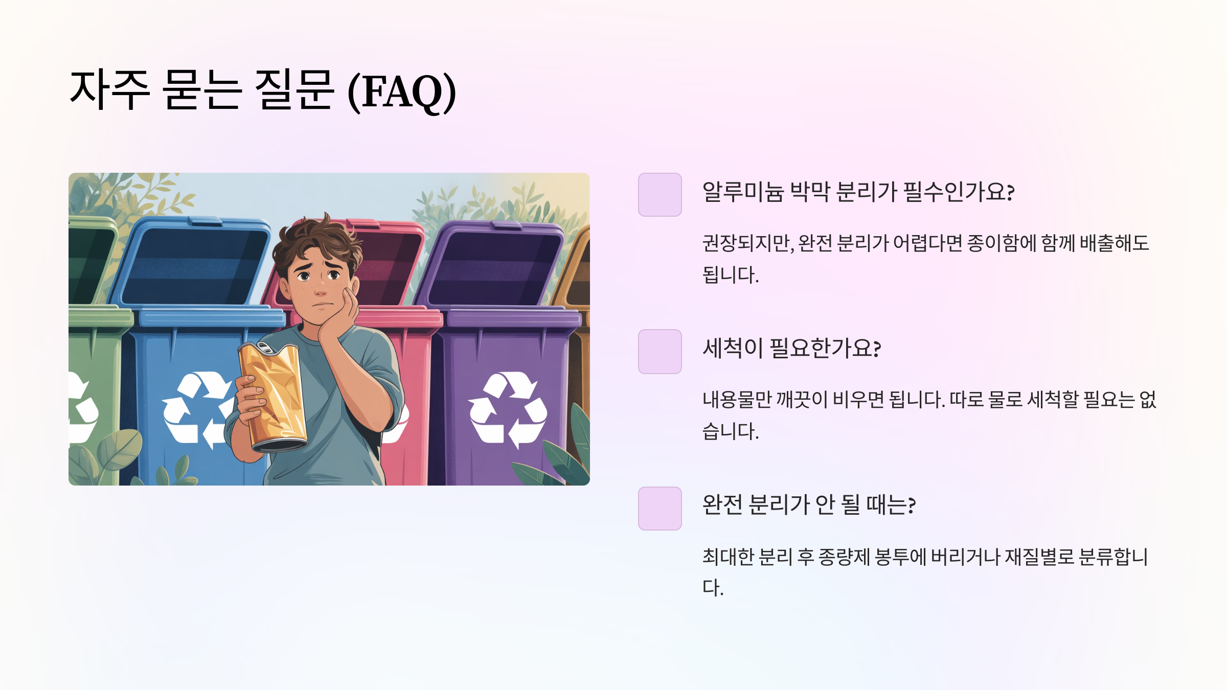 나의느낌으로 말하자면, 이 작은 캔 하나가 재활용에 이렇게 까다롭다니 참 아이러니하다고 느껴져요. 하지만 알고 나면 분리 방법은 그리 어렵지 않답니다. 😊