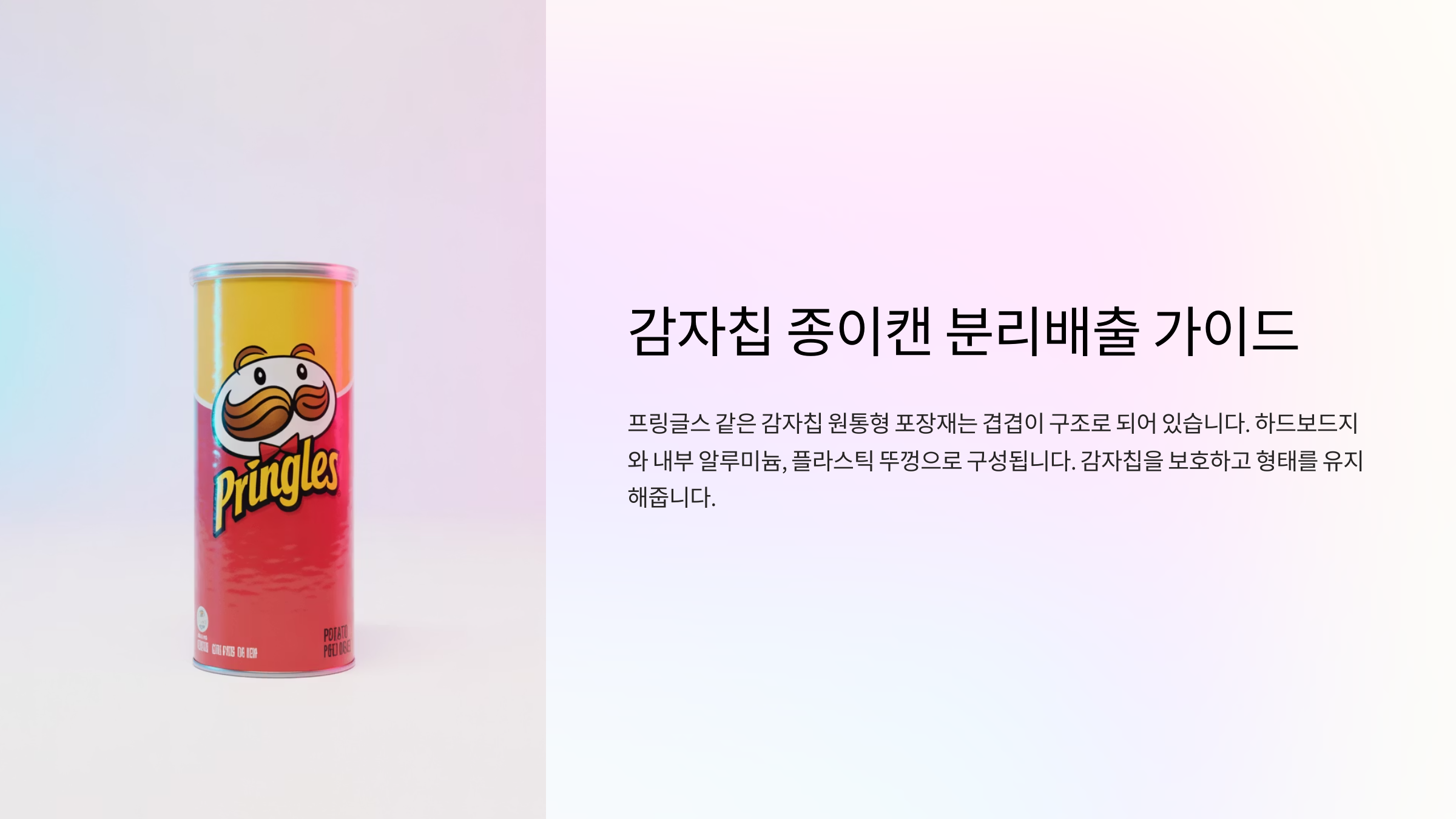 Q1. 감자칩 종이캔 전체를 종이류로 버려도 되나요?A1. 아니에요! 종이캔은 내부에 알루미늄과 접착제가 있어서 종이류로 재활용되지 않아요. 반드시 분리해서 배출해야 해요.