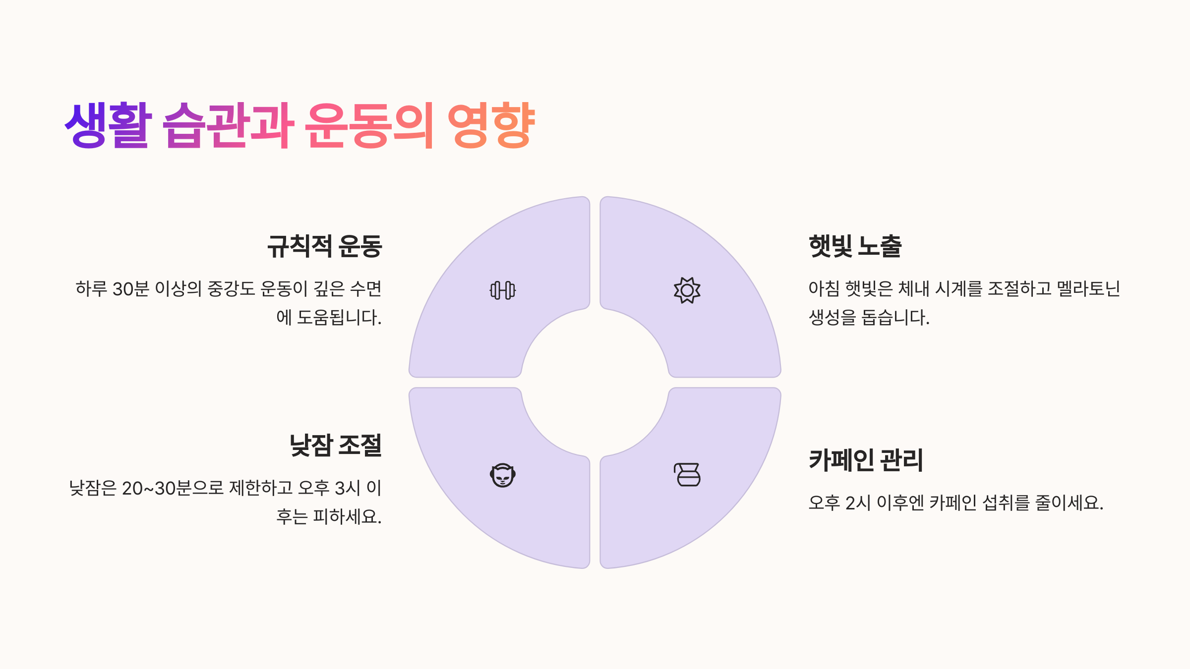 건강한 수면을 위해서는 하루 중 어떻게 움직이고 생활하는지도 중요해요. 낮 동안의 활동량이 적으면 밤에 몸이 충분히 피곤해지지 않아서 잠드는 데 어려움을 겪을 수 있거든요. 그래서 꾸준한 운동 습관이 꿀잠의 핵심 요소 중 하나예요.