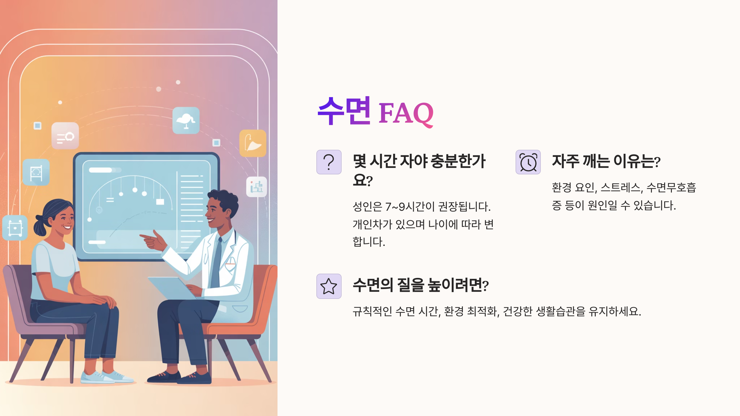 A7. 일관된 수면 루틴이에요. 같은 시간에 자고 일어나는 습관만 잘 지켜도 수면의 질은 확연히 달라져요.