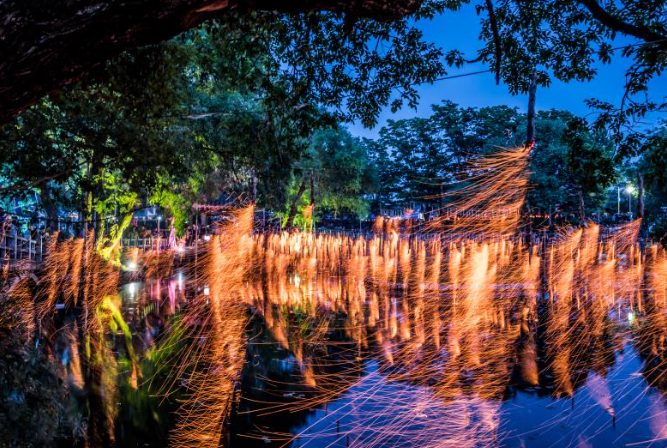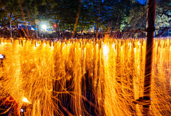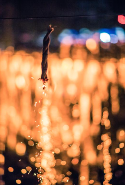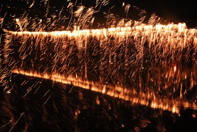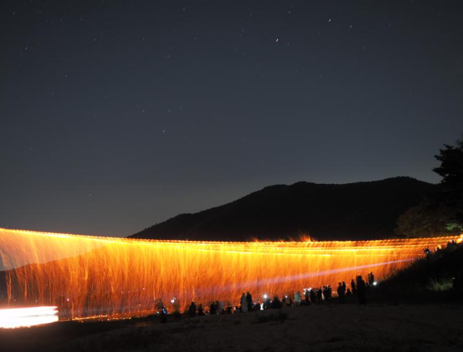 철사는 대나무를 안정적으로 지탱할 수 있도록 단단히 고정해야 하며, 불꽃이 떨어질 때 안전하게 유지될 수 있도록 해야 합니다. 이 과정에서 철사의 길이와 굵기는 불꽃의 형성과 방향에 큰 영향을 미칩니다. - 불 붙이기: 틀을 완성한 후, 숯과 소금을 사용해 불을 붙입니다. 불이 붙으면 한지가 천천히 타오르며 불꽃이 아래로 떨어지기 시작합니다.