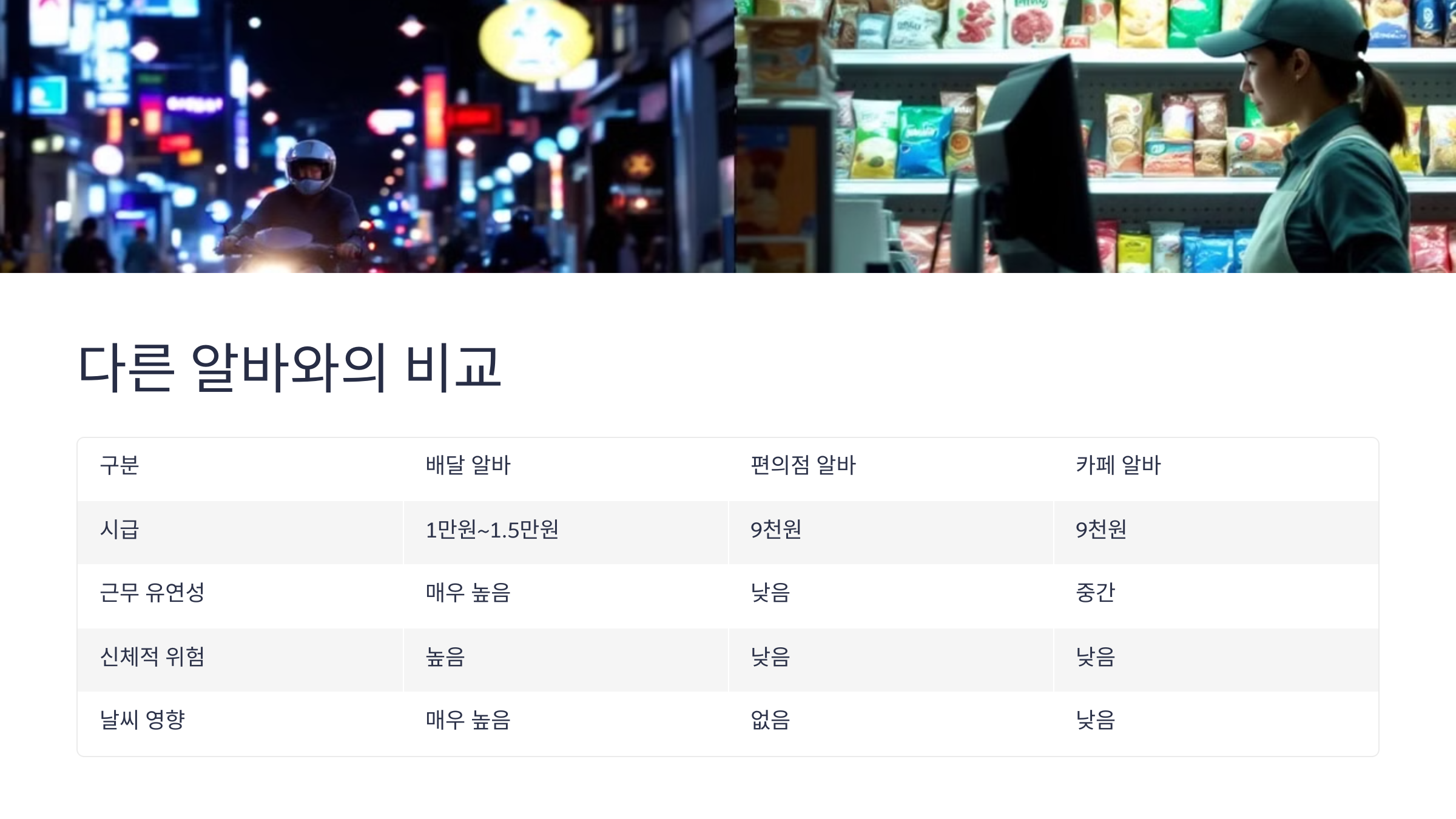 다른 알바와의 비교 배달 대행 알바는 단기적으로 빠른 수익을 얻기에 좋은 선택이지만, 다른 아르바이트와 비교해보면 분명한 장단점이 있어요. 대표적으로 편의점 알바, 카페 알바, 물류센터 단기 알바 등과 자주 비교되죠. 가장 큰 차이점은 바로 ‘수입의 유동성’이에요.