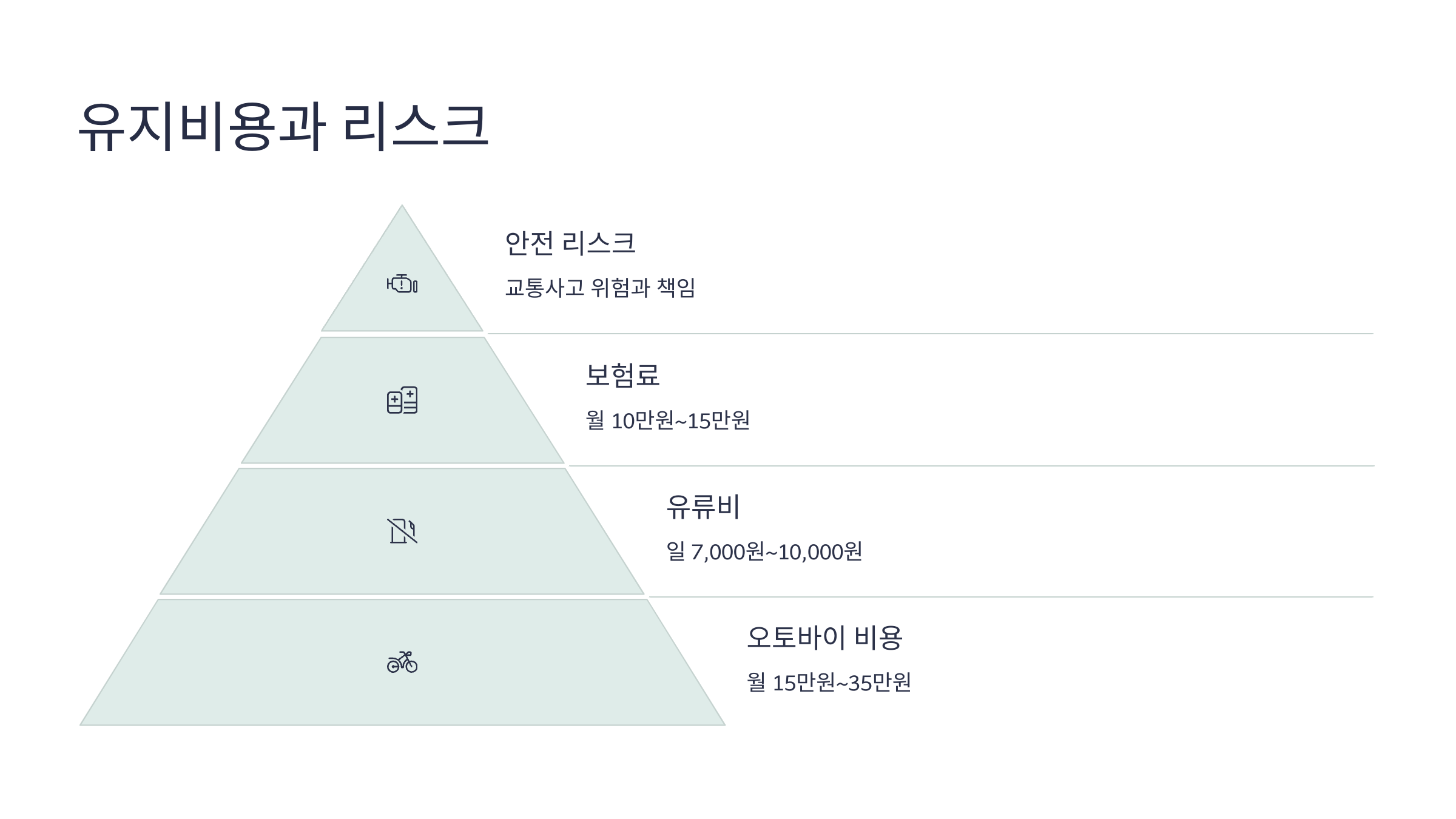 가장 큰 리스크는 ‘사고’예요. 특히 비 오는 날, 겨울철 도로는 사고 확률이 급격히 올라가요. 실제로 일하다 다치는 경우 병원비는 물론, 몇 주간 수입이 끊기기 때문에 큰 타격이 되죠. 그래서 실손보험, 배달 보험 등 추가적인 안전장치 마련이 중요해요.