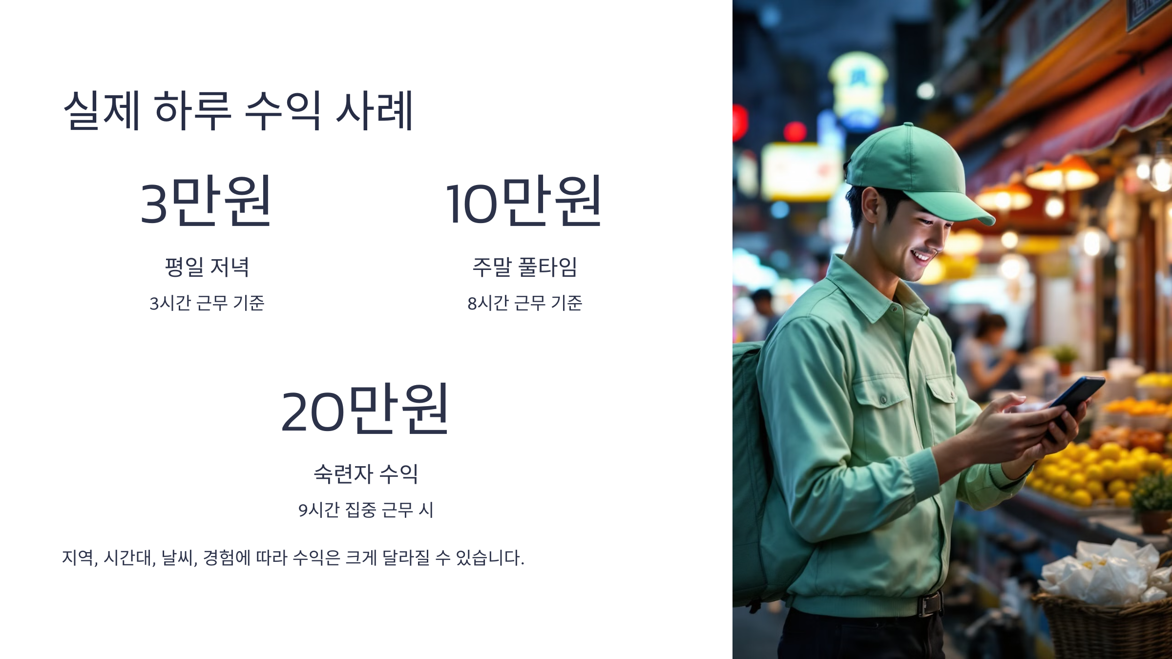 수익은 하루에 몇 시간 일하느냐, 어느 시간대에 집중하느냐, 날씨나 이벤트 여부에 따라서도 크게 달라져요. 그래서 동일한 플랫폼이라도 사용자마다 수익 차이가 상당히 크답니다.