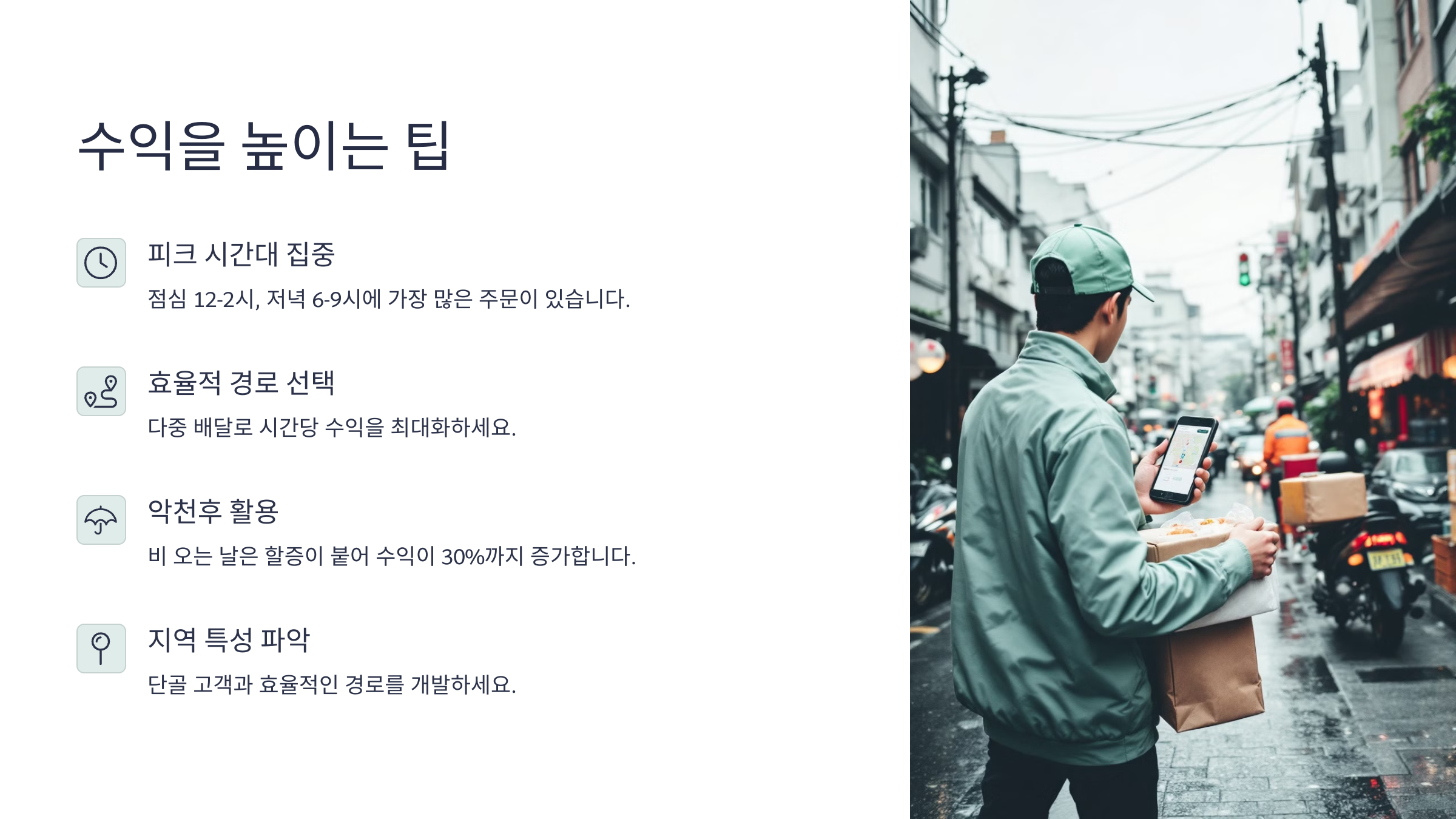 수익을 높이는 팁 배달 알바에서 수익을 높이려면 단순히 '많이' 하는 게 아니라 '똑똑하게' 움직여야 해요. 콜이 몰리는 시간대를 노리고, 효율적인 동선으로 움직이는 게 핵심이에요. 특히 점심 11~2시, 저녁 5~9시는 반드시 잡아야 할 황금 타임이랍니다.