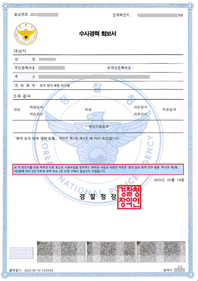 ✔ 본인 확인용 범죄경력 · 수사경력 회보서: 개인이 자신의 범죄 이력을 확인하기 위해 신청하는 문서예요. 이 문서는 본인만 발급받을 수 있으며, 타인에게 제공할 수 없어요.
