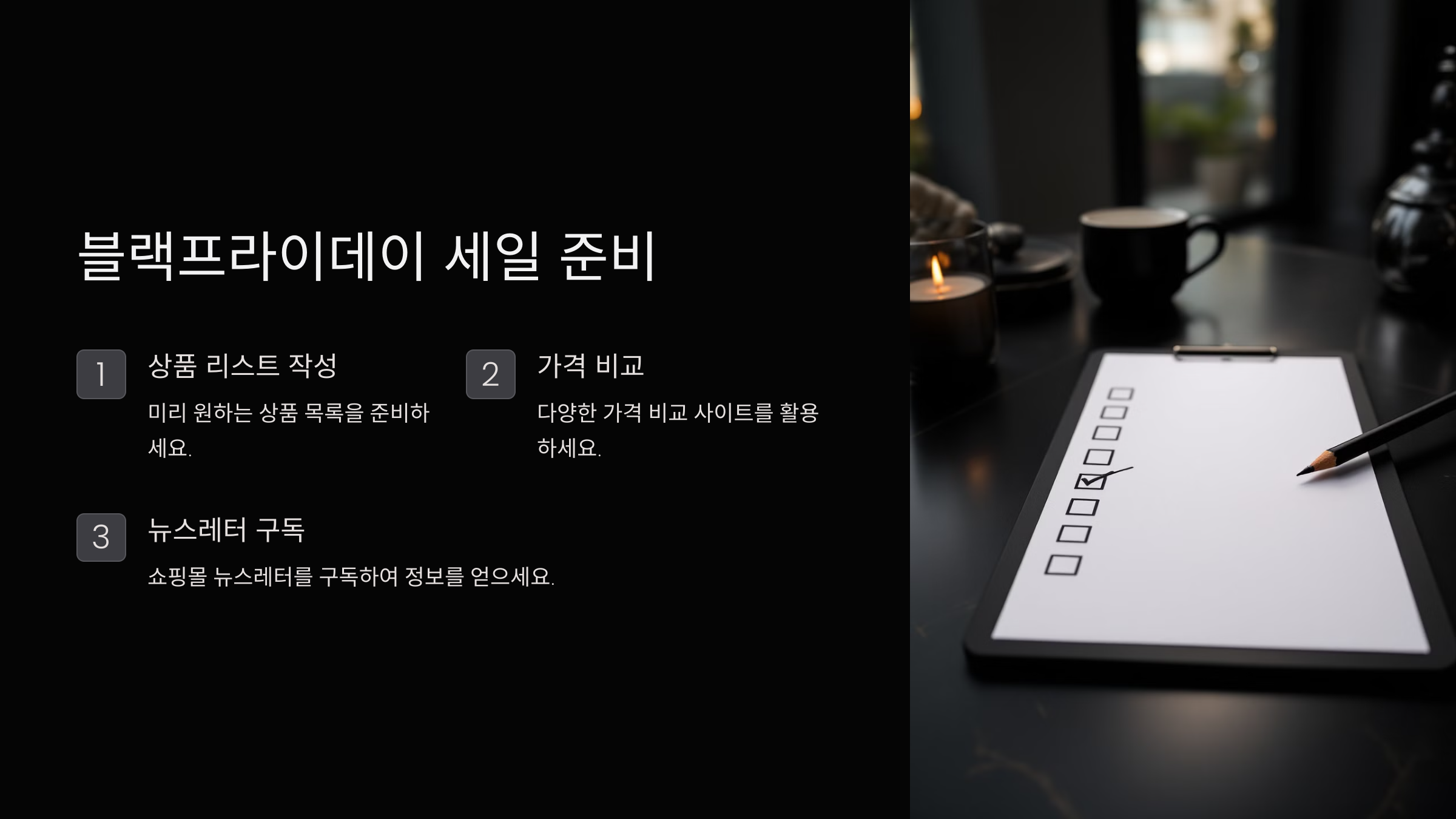 블랙프라이데이에 대비하려면 미리 준비하는 것이 중요해요. 먼저, 구매하고 싶은 아이템 리스트를 작성하세요. 어떤 제품을 사고 싶은지 미리 계획을 세우면 세일 기간 동안 너무 많은 선택지에 휘둘리지 않고 효율적인 쇼핑을 할 수 있어요.