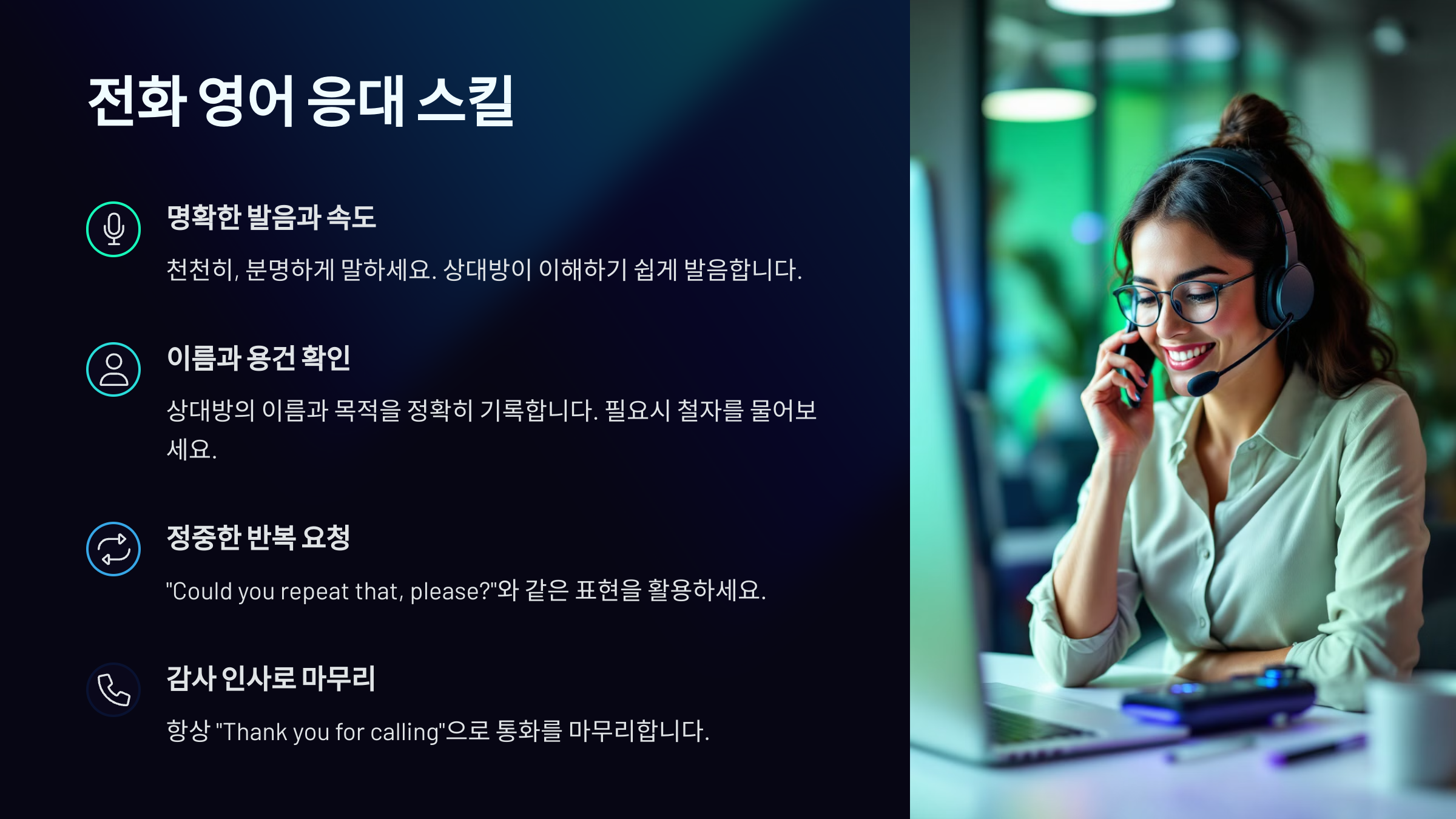 전화 영어는 패턴 익히기 + 음성으로 따라 말해보기가 핵심이에요. 유튜브에 “business phone call English” 검색해서 들어보는 것도 좋아요!