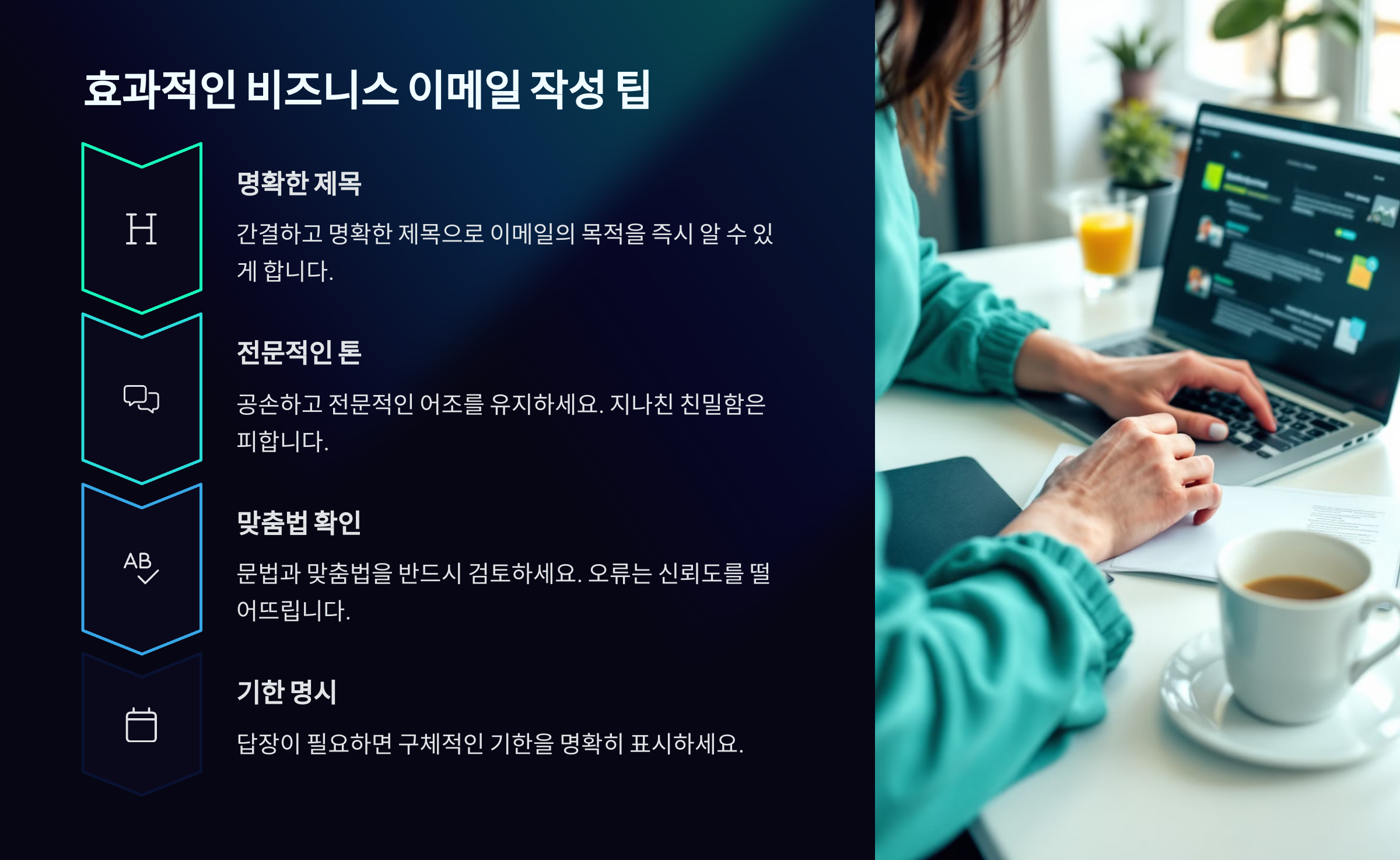 비즈니스 이메일은 '톤'과 '구조'가 정말 중요해요. 친근하면서도 예의 바른 어투를 유지해야 하죠. 일반적인 영어 회화보다 포멀하게, 하지만 너무 딱딱하지 않게 쓰는 게 포인트예요!