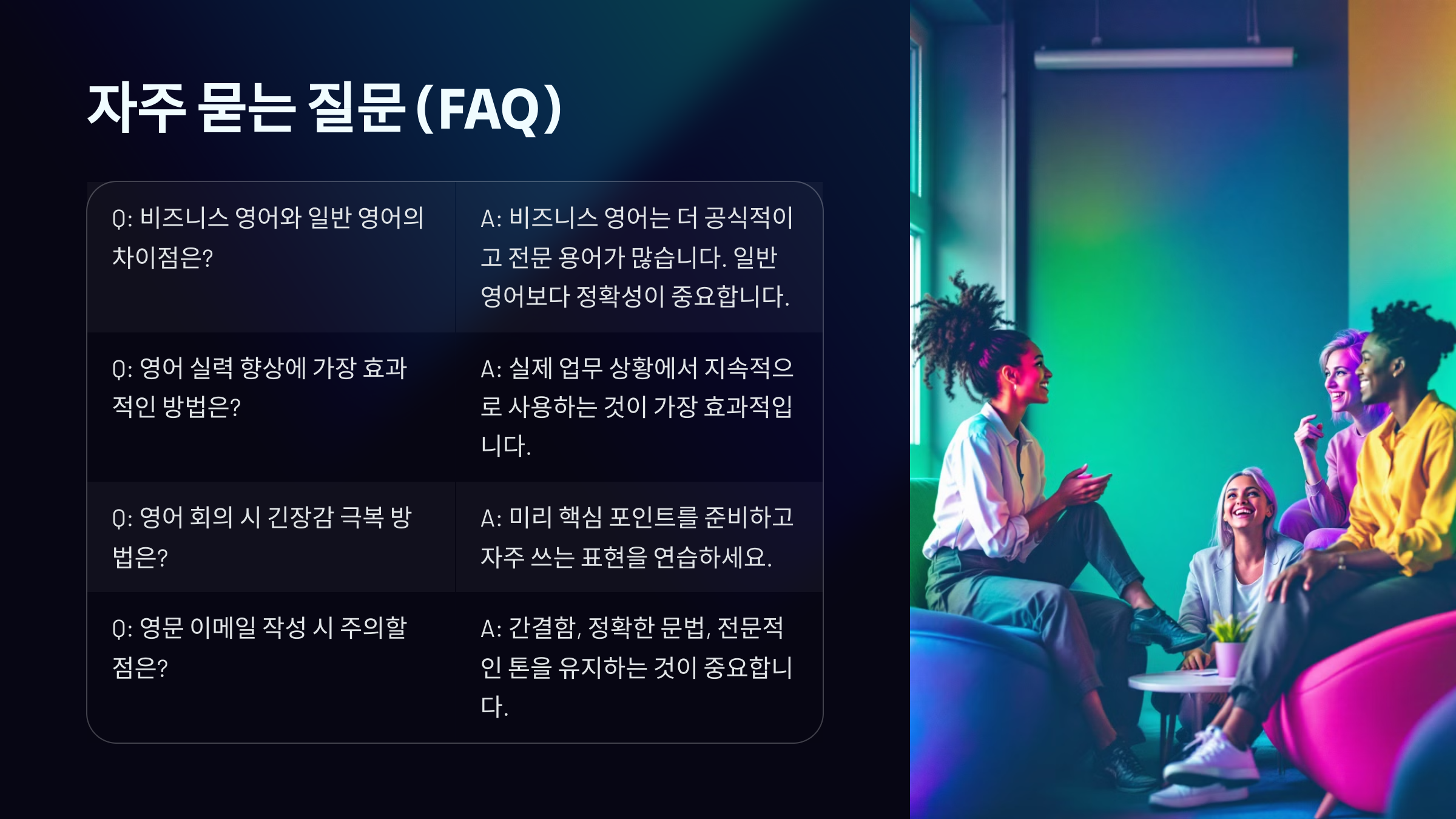 특히 IT, 무역, 스타트업, 외국계 기업에서는 영어 회화 실력이 곧 경쟁력이에요. 말을 잘하지 않아도 비즈니스 톤과 구조를 알고 있으면 훨씬 더 신뢰감 있고 정확한 인상을 줄 수 있어요 💡