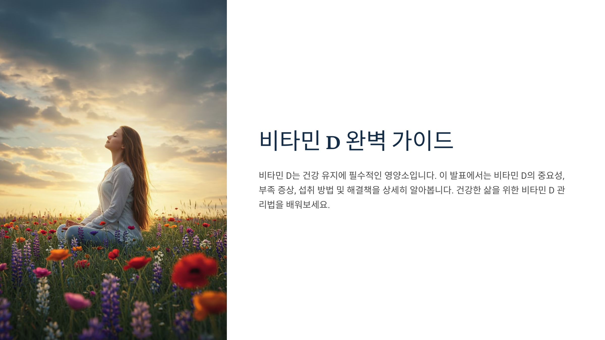 👉 지방과 함께 섭취하면 흡수율이 증가합니다. 이제 비타민 D 부족 증상 및 해결법이 완벽하게 정리되었습니다! ☀️