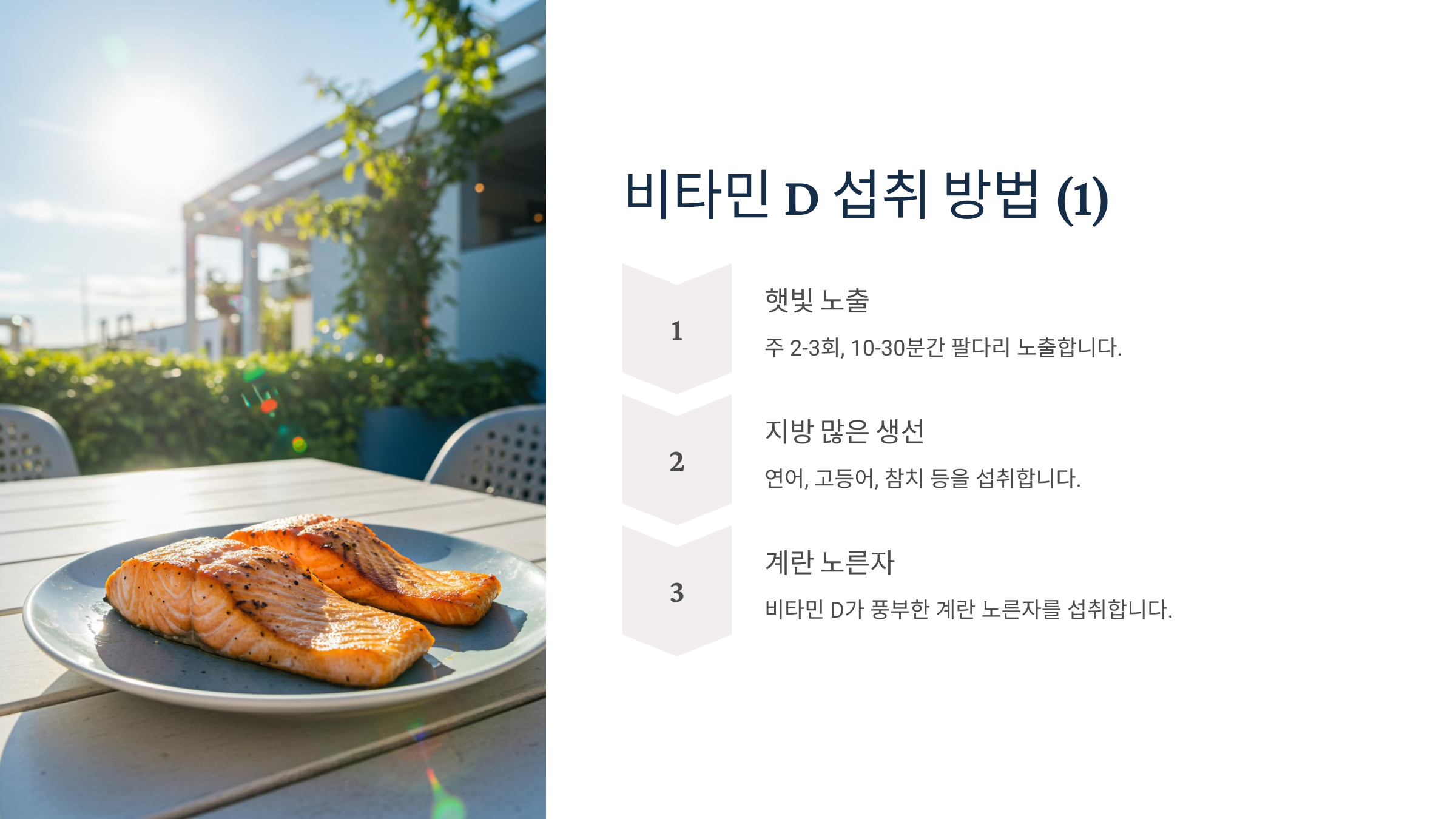 ✔ 연어, 참치, 계란노른자, 버섯 등 비타민 D 함유 식품 섭취 💊 비타민 D 보충제