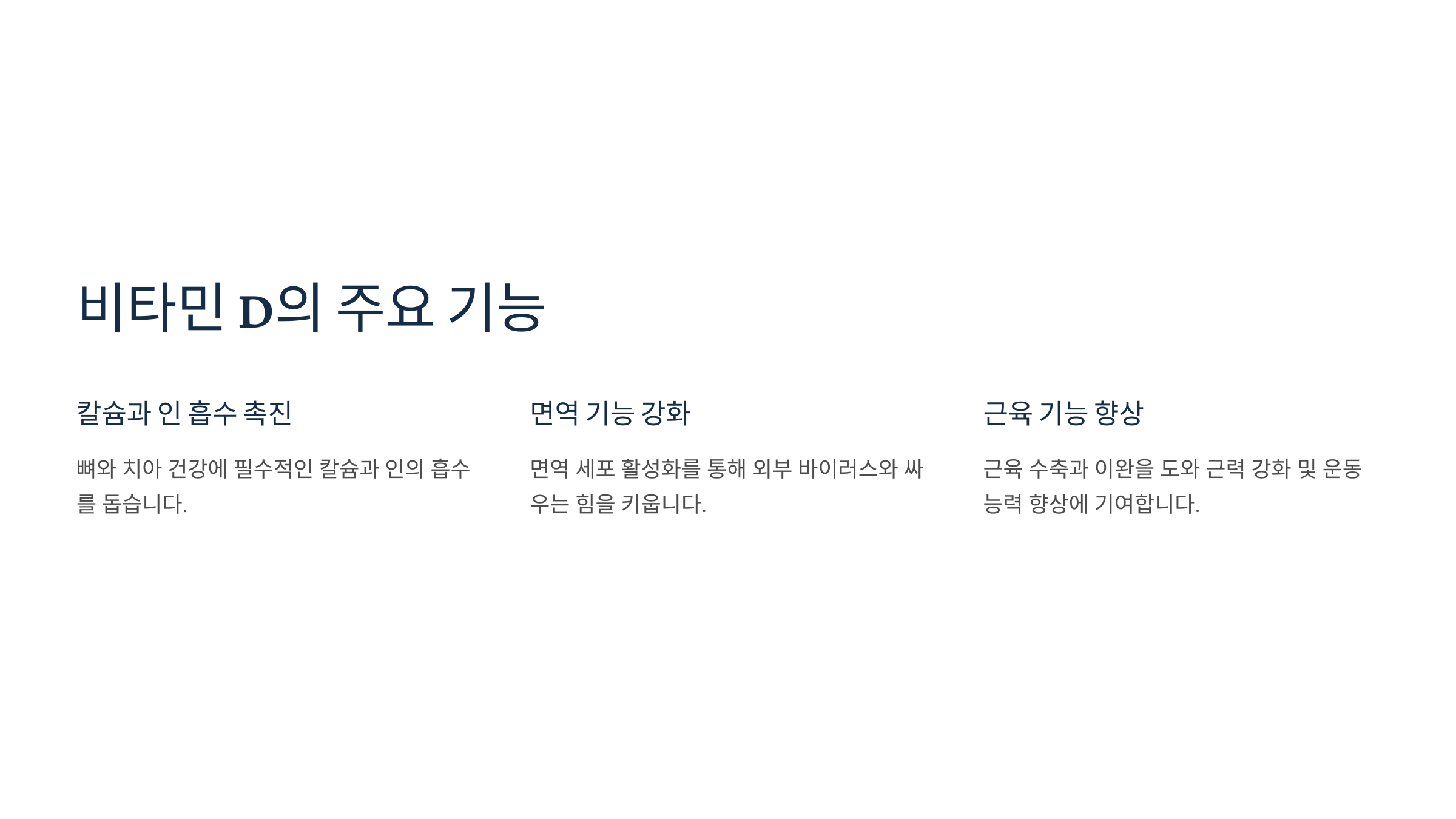 비타민 D는 칼슘 흡수를 도와 뼈 건강을 유지하고, 면역 체계를 강화하는 중요한 영양소입니다. 주로 햇빛을 통해 체내에서 합성되며, 일부 음식과 보충제를 통해 섭취할 수도 있어요.