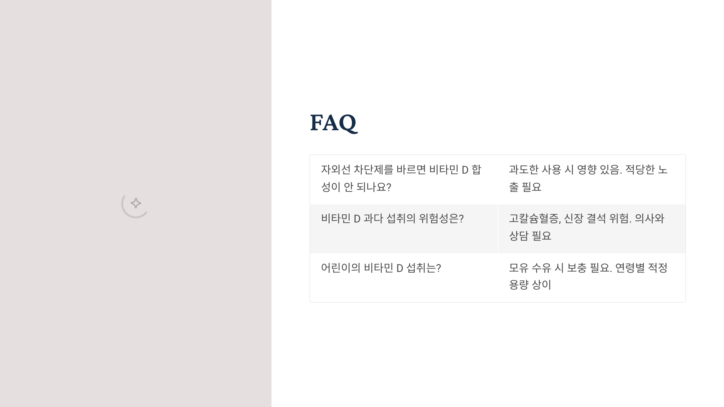 👉 과다 섭취 시 칼슘 수치가 높아져 신장 결석, 메스꺼움 등이 발생할 수 있어요.