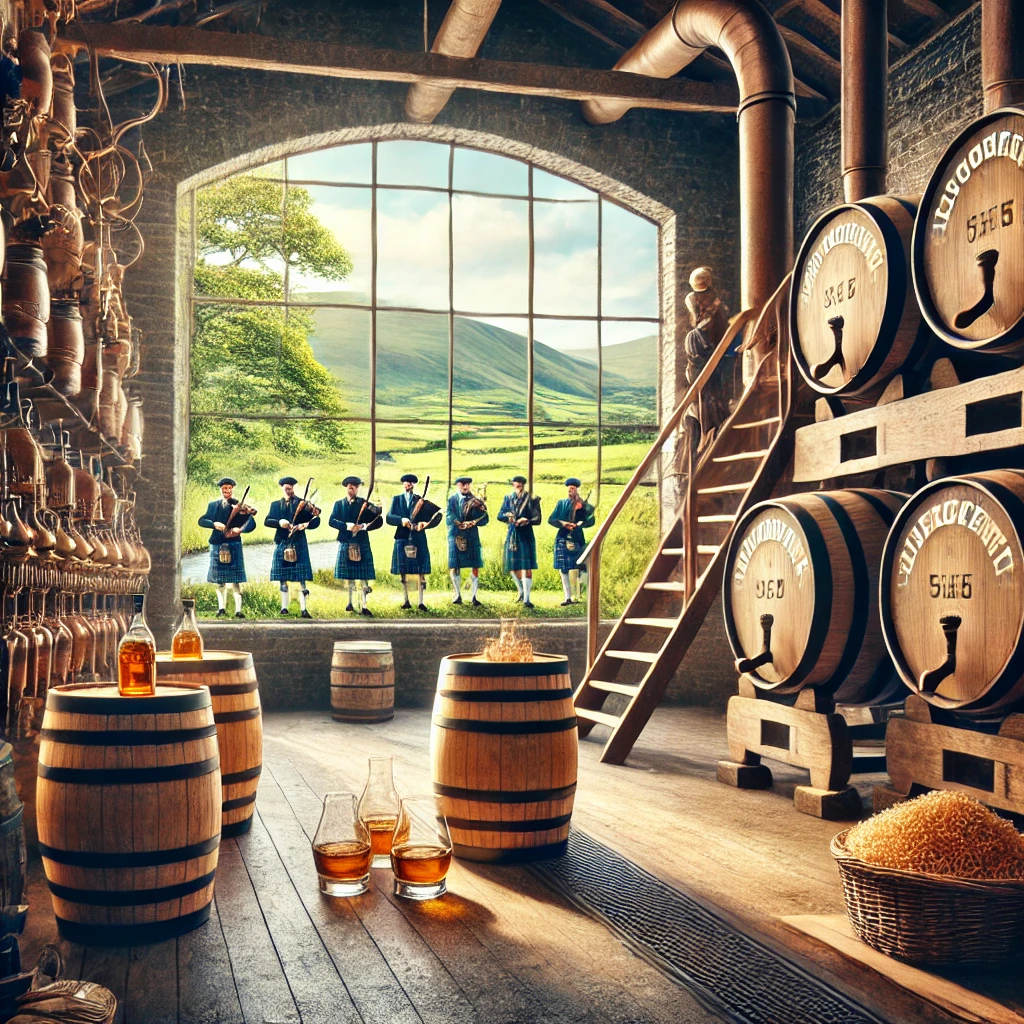 스코틀랜드 위스키는 그 지역의 물과 보리를 사용하여 제조되며, 오크통에서 숙성 과정을 거쳐 깊은 풍미를 갖추게 됩니다.