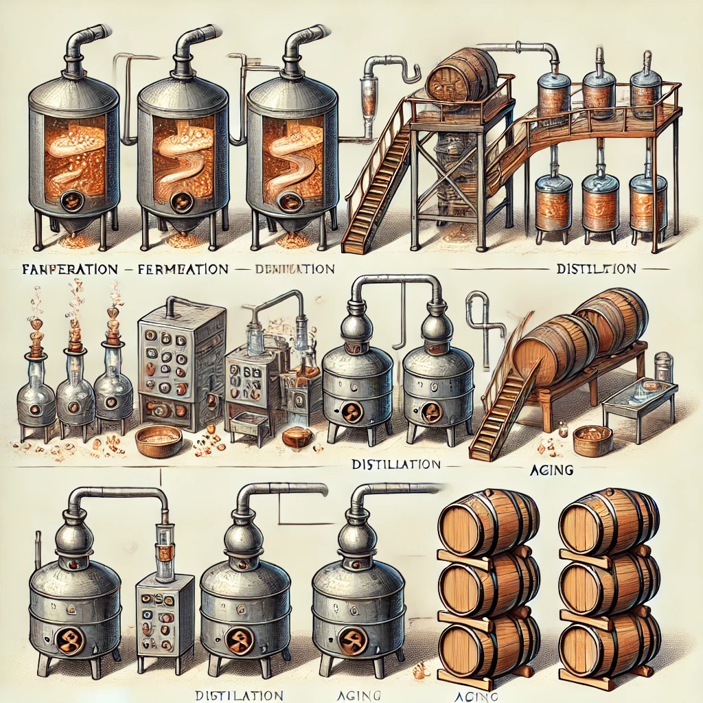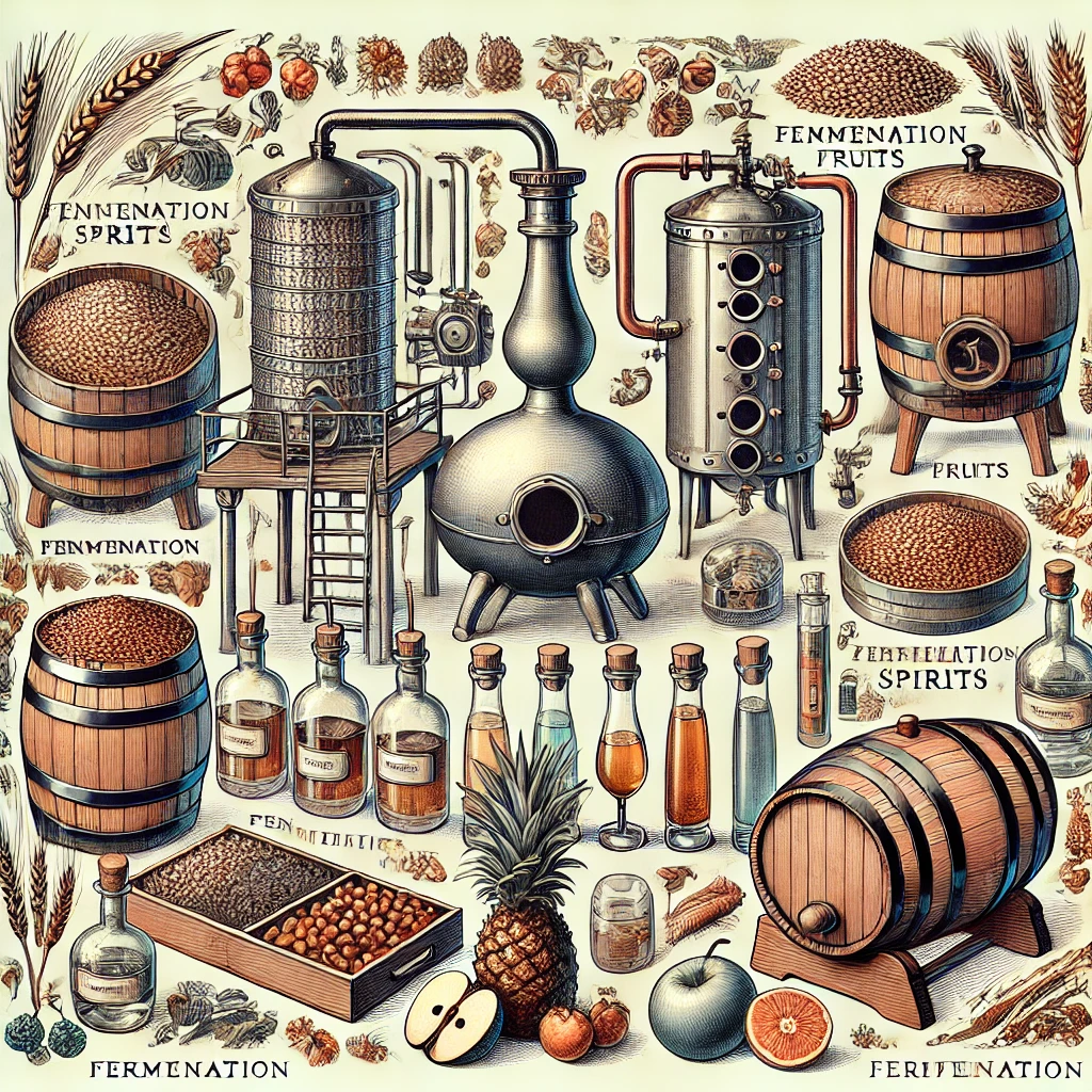 증류주의 제조 과정은 크게 세 단계로 나눌 수 있습니다: 발효, 증류, 숙성입니다. 발효 과정에서는 재료에 있는 당분이 효모에 의해 알코올로 변환됩니다.