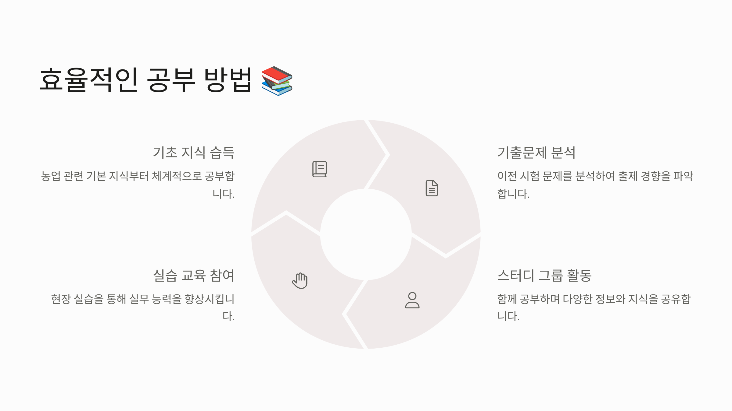 A2. 네, 충분히 가능해요! 농업 관련 전공자가 유리할 수 있지만, 비전공자도 기출 문제와 기본서 중심으로 학습하면 충분히 합격할 수 있어요.