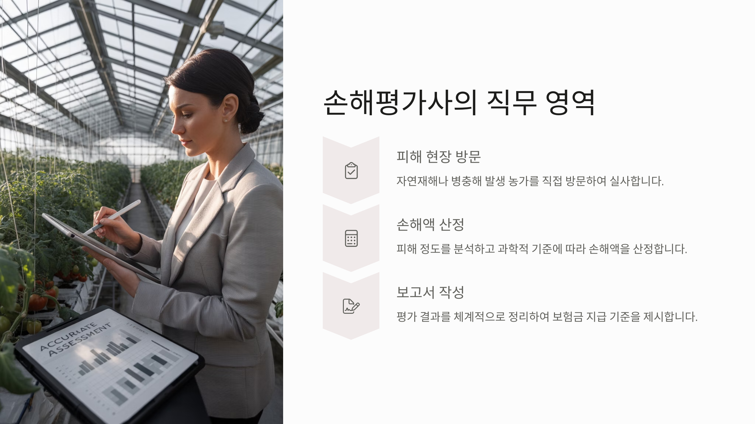 이 직업은 단순히 현장을 보고 피해를 산출하는 데 그치지 않고, 객관적이고 신뢰성 있는 기준을 바탕으로 손해 규모를 산정해 농민들이 보험금을 제대로 받을 수 있도록 도와줘요. 즉, 농업인의 경제적 손실을 최소화하고, 정부나 보험사의 신뢰도도 함께 지키는 핵심 인력이에요.