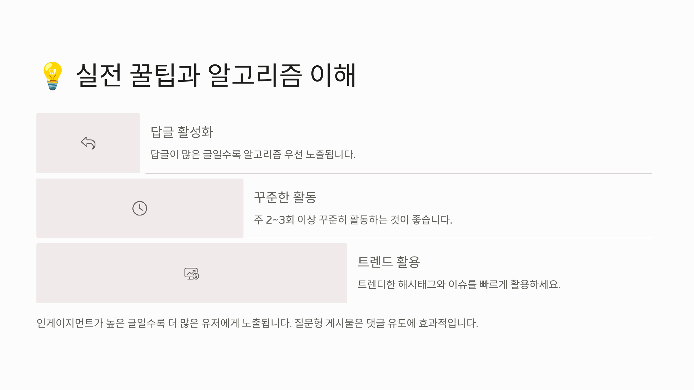 영향 요소 중요도 활용 팁 글 게시 빈도 ★★★★☆ 하루 1~2회 유지 댓글 활동 ★★★★★ 적극적 소통 해시태그 사용 ★★★☆☆ 관심사 표현 리포스트 ★★★★☆ 주제 연결 활용 알고리즘은 결국 ‘어떤 유저가 활발하고 유익한가’를 판단해요. 나를 브랜딩하고, 일관된 메시지를 던지면 AI가 나를 추천할 이유를 만들어주는 셈이에요. 이 점, 꼭 기억해두세요! 💡