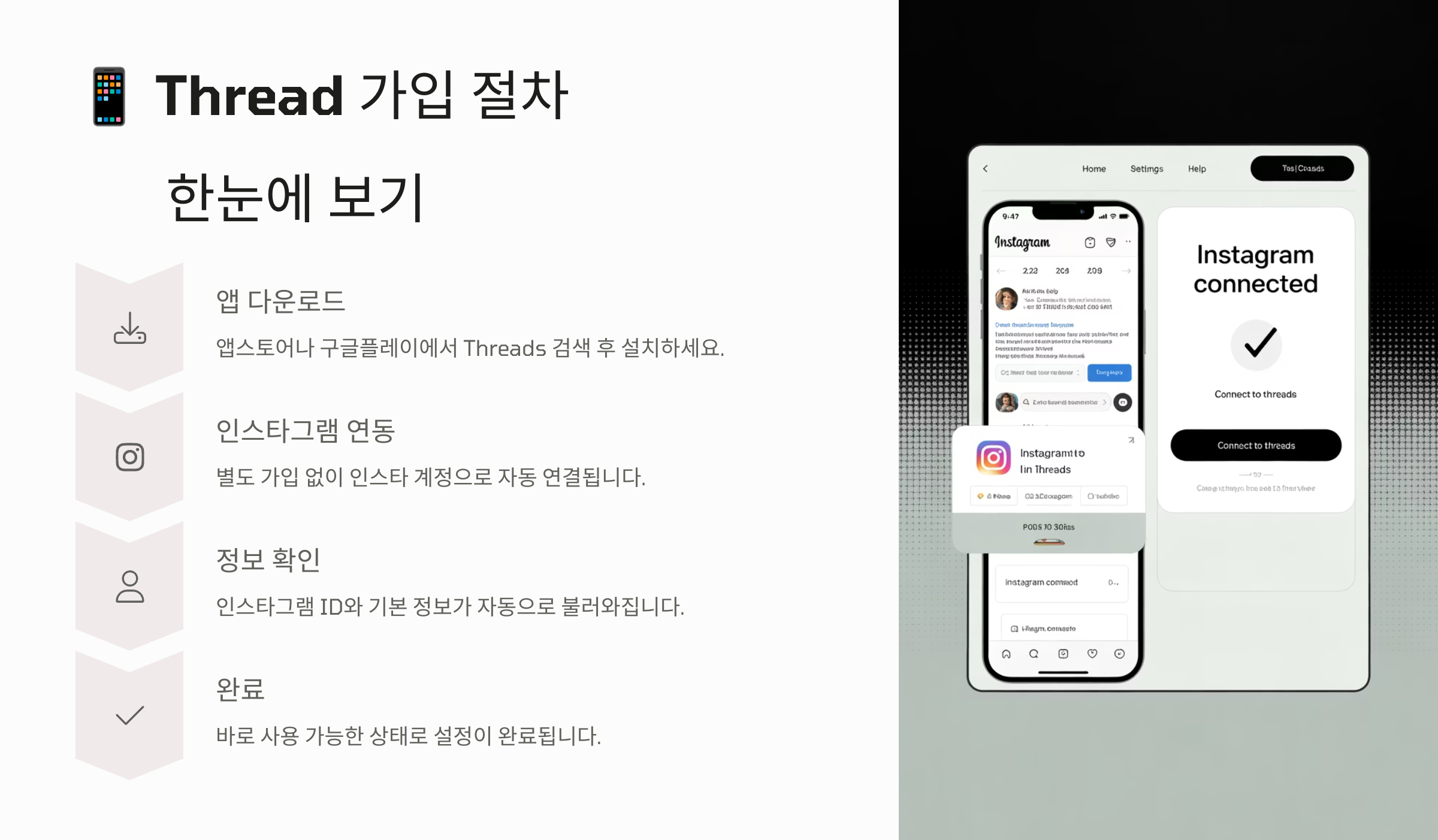 항목 Thread Instagram 로그인 방식 Instagram 연동 로그인 이메일, 전화번호 가능 게시글 유형 텍스트 중심 이미지 중심 댓글 기능 활성 활성 알고리즘 추천 팔로우 기반 + 알고리즘 AI 추천 가입 절차가 너무 쉬워서 누구나 부담 없이 시작할 수 있는 게 Thread의 큰 장점이에요. 인스타그램 계정을 활용하는 구조라 SNS 초보자도 쉽게 적응할 수 있답니다!