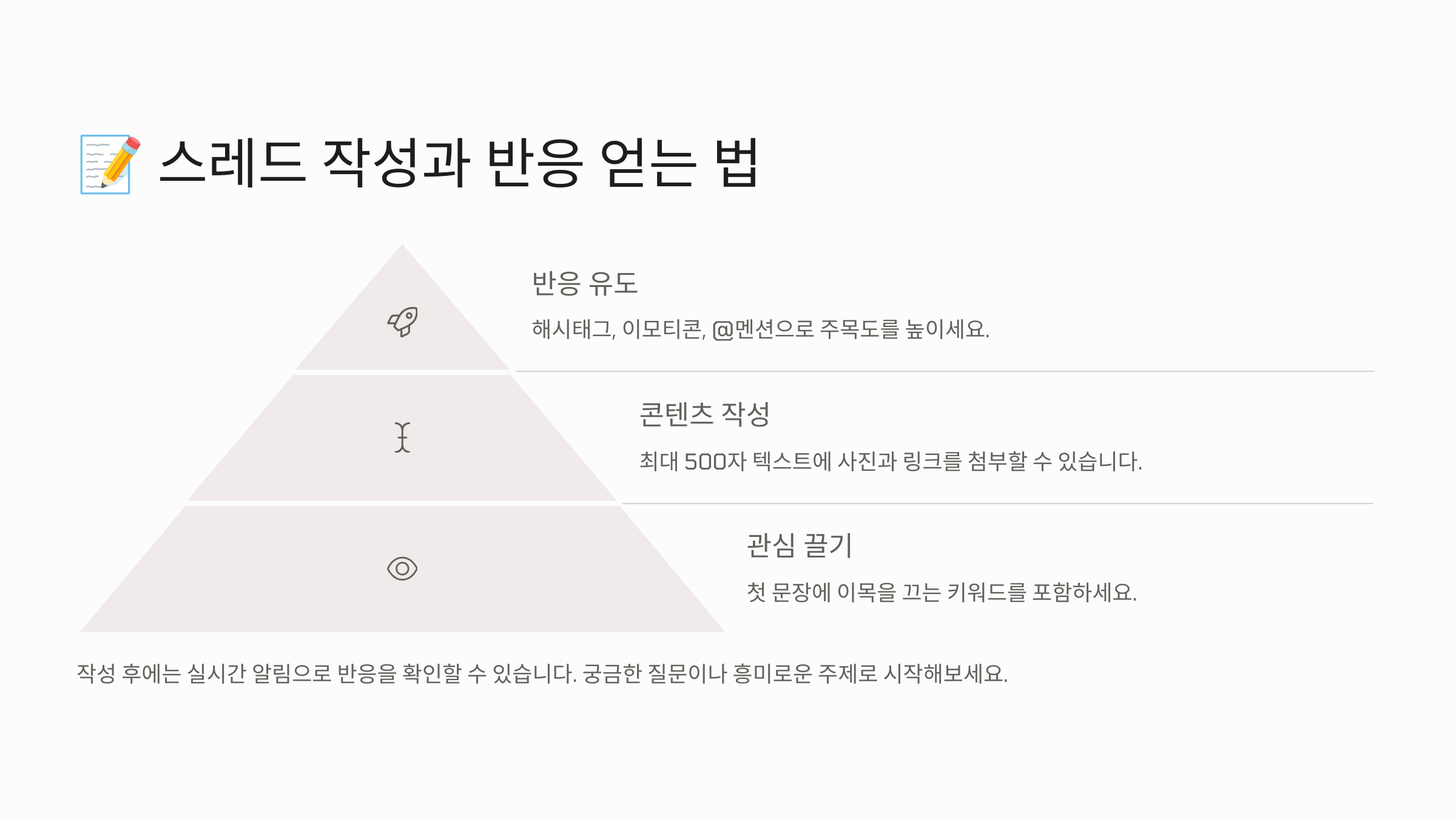 상호작용 방식 효과 실전 팁 댓글 개별 소통 강화 짧지만 진심 담기 리포스트 주제 공유 및 영향력 상승 코멘트 추가 추천 좋아요 관심 표현 자주 눌러주기 멘션(@) 직접 대화 가능 대화 걸기 유용 댓글, 리포스트, 좋아요는 단순한 클릭이 아니에요. 나를 기억시키고, 나의 관심사를 보여주는 최고의 방법이에요. Thread는 결국 ‘관계’의 SNS예요! 💬