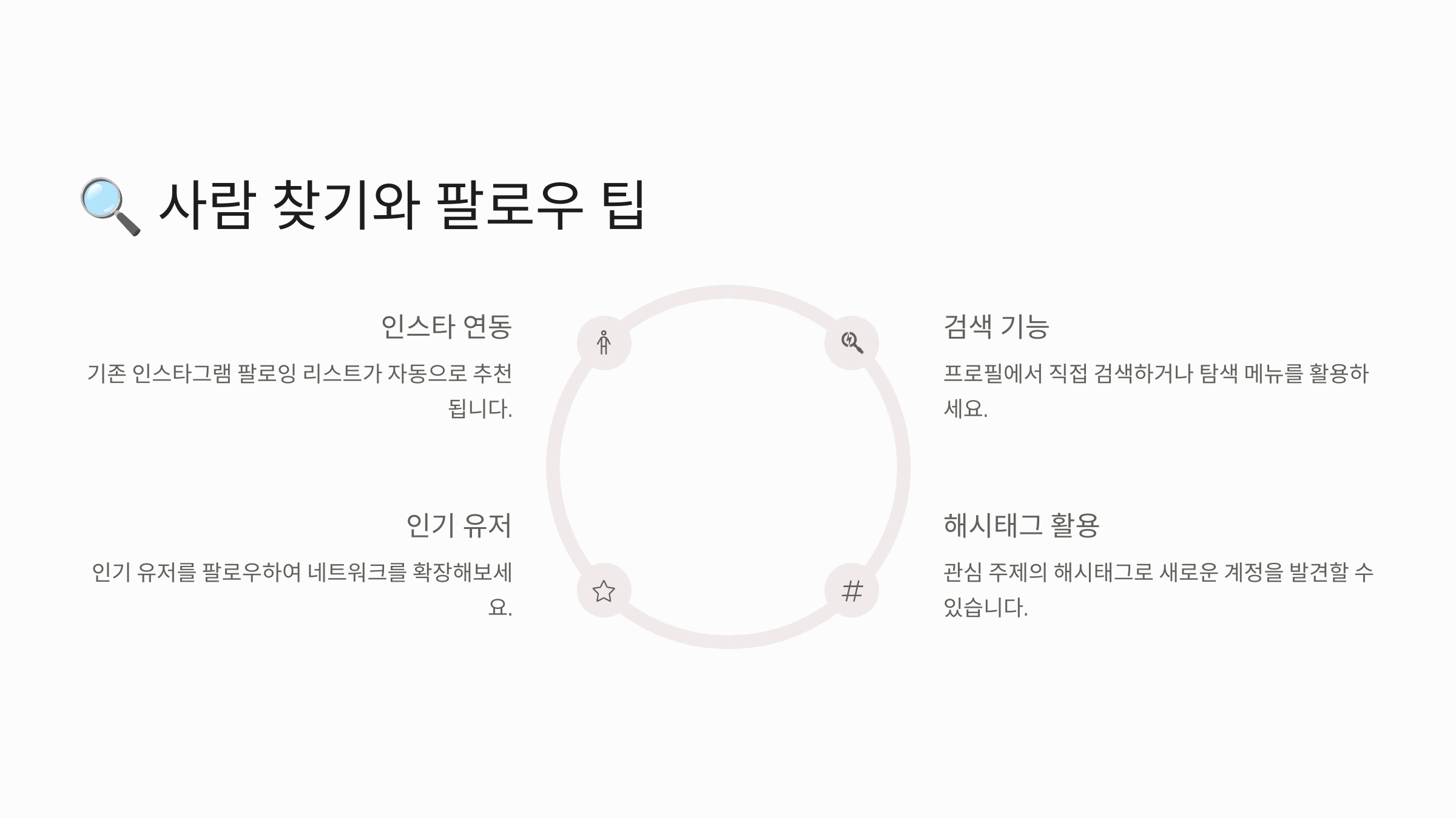 또한 알고리즘은 ‘유사한 관심사’의 유저끼리 연결해주려고 해요. 그래서 해시태그는 생각보다 큰 역할을 해요. 예: #UX디자인, #커피러버, #영화추천 등은 내가 어떤 사람인지 보여주는 단서가 돼요.