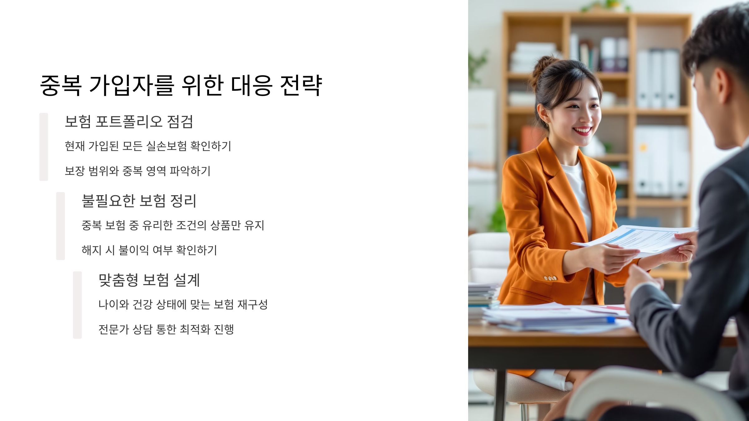 또한, 일부 보험 설계사들이 실손 중복 가입 가능성을 알고 있음에도 불구하고 판매 실적을 위해 새로운 상품을 권유하는 경우도 있어요. 이 과정에서 소비자 입장에선 “기존 상품이 오래돼서 이제는 안 좋아졌나 보다”라고 착각하고 다시 가입하는 일이 발생하죠.