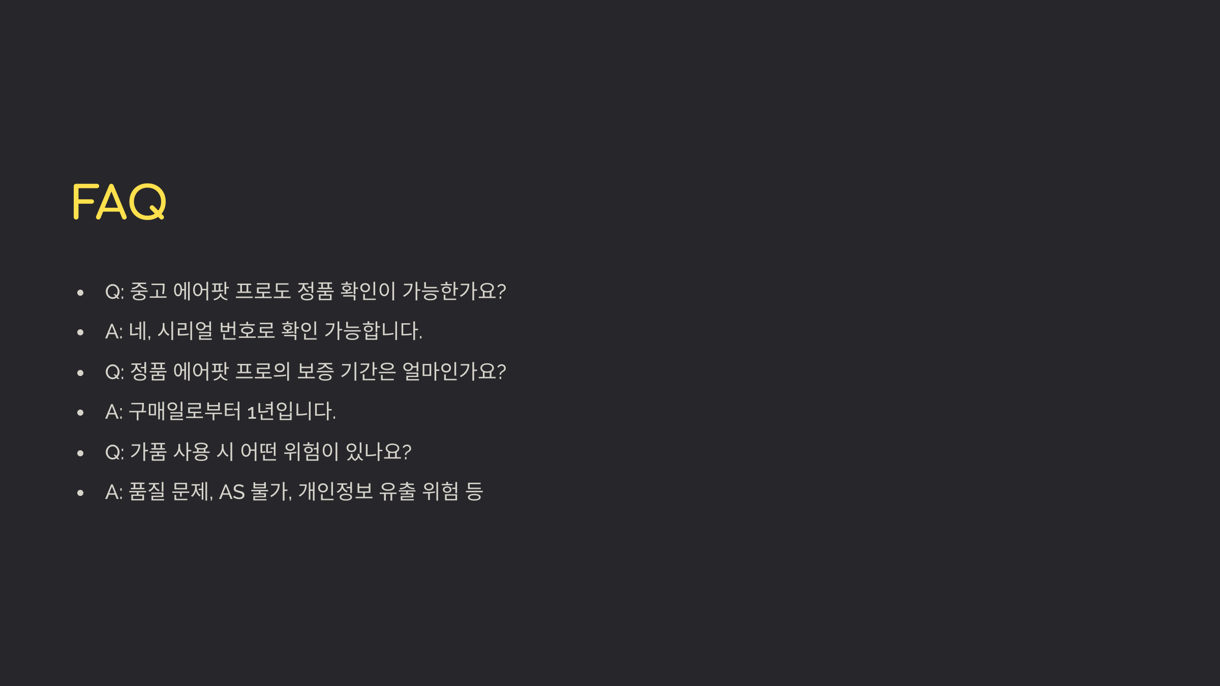 A7. 정품 에어팟 프로는 1년 보증 기간 내에 결함이 발생하면 애플에서 무료로 교체해 줍니다.