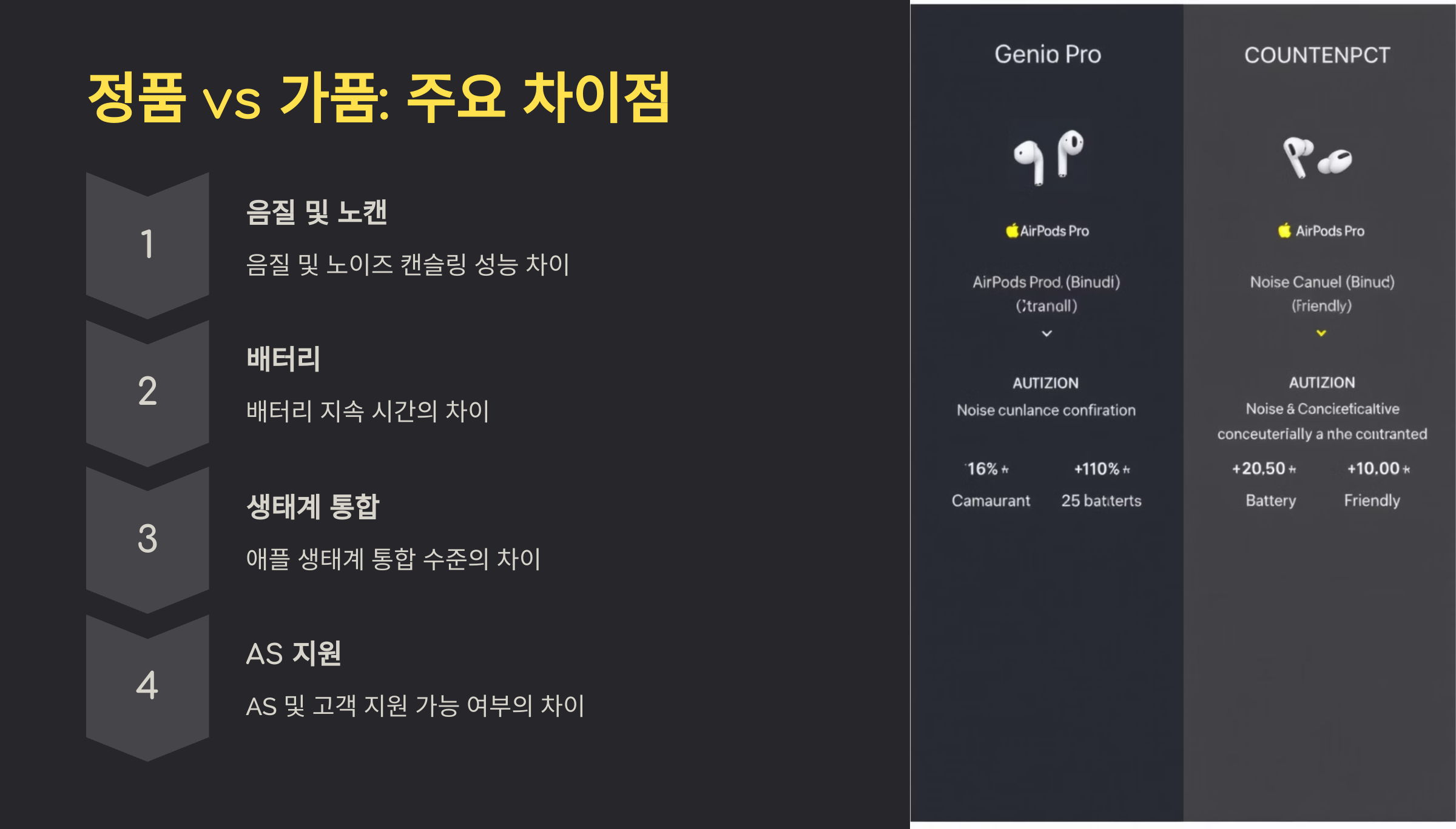 정품과 가품의 차이점은 여러 가지가 있어요. 첫 번째로, 음질에서 차이가 납니다. 정품은 훌륭한 음질을 제공하며, 노이즈 캔슬링 기능도 탁월하지만, 가품은 음질이 왜곡되거나 소음 차단이 제대로 되지 않는 경우가 많아요.