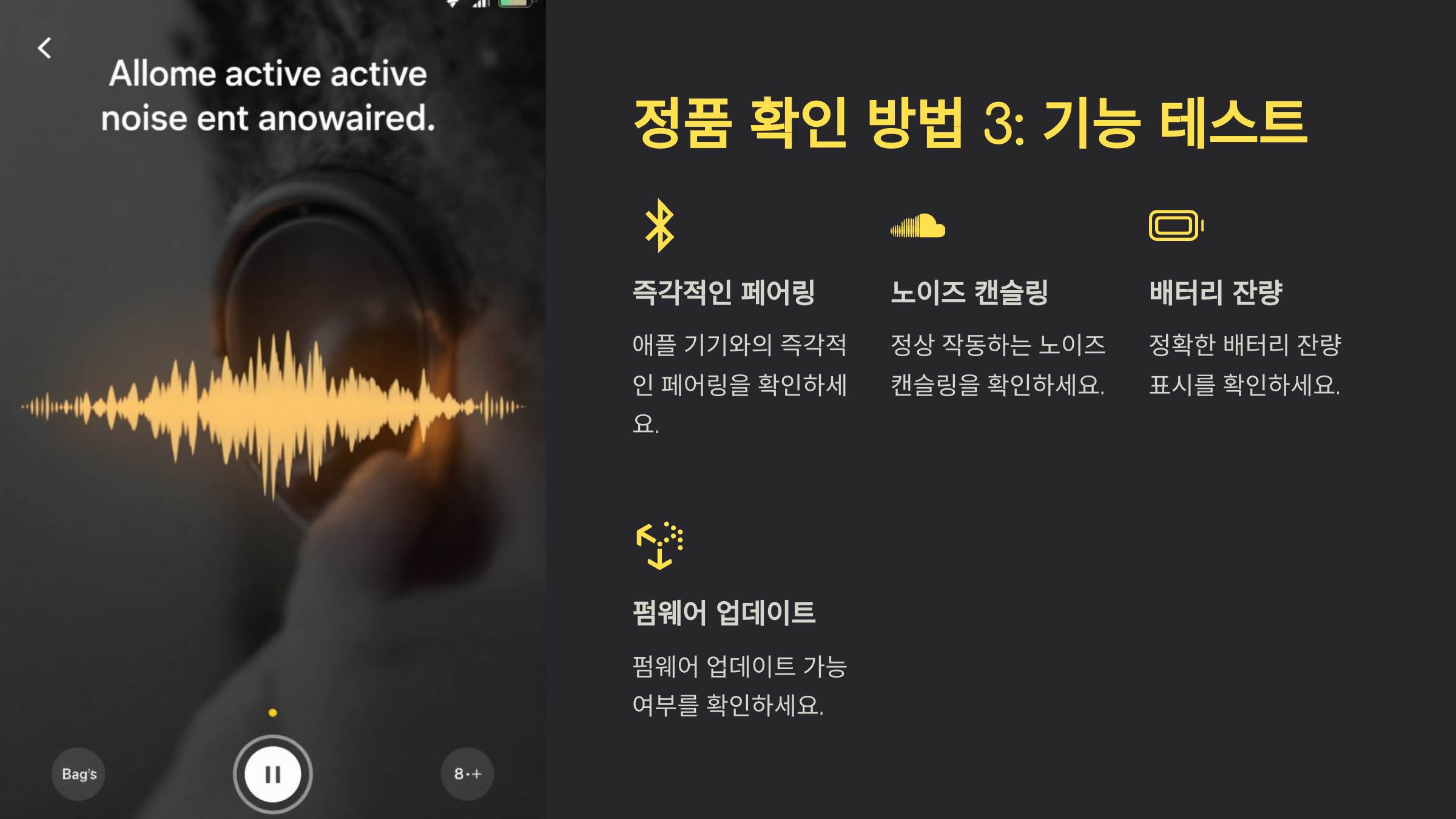 정품은 노이즈 캔슬링과 공간 음향 기능도 정상적으로 작동해야 해요. 이를 확인하려면, 설정에서 노이즈 캔슬링 모드를 활성화하고, 이어폰을 착용한 후 외부 소리가 줄어드는지 확인해 보세요. 가짜 제품은 이 기능이 제대로 작동하지 않거나, 소음 차단 효과가 매우 약해요.