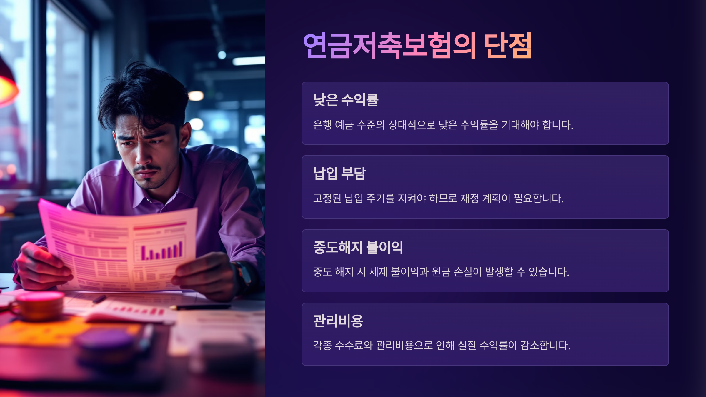 하지만 단점도 분명히 존재해요. 첫째로, 중도 해지 시 ‘과세’와 ‘해지환급금 손해’가 발생할 수 있다는 점이에요. 55세 이전에 돈이 급해서 찾게 되면, 납입 원금보다 손해를 보는 경우도 있거든요.