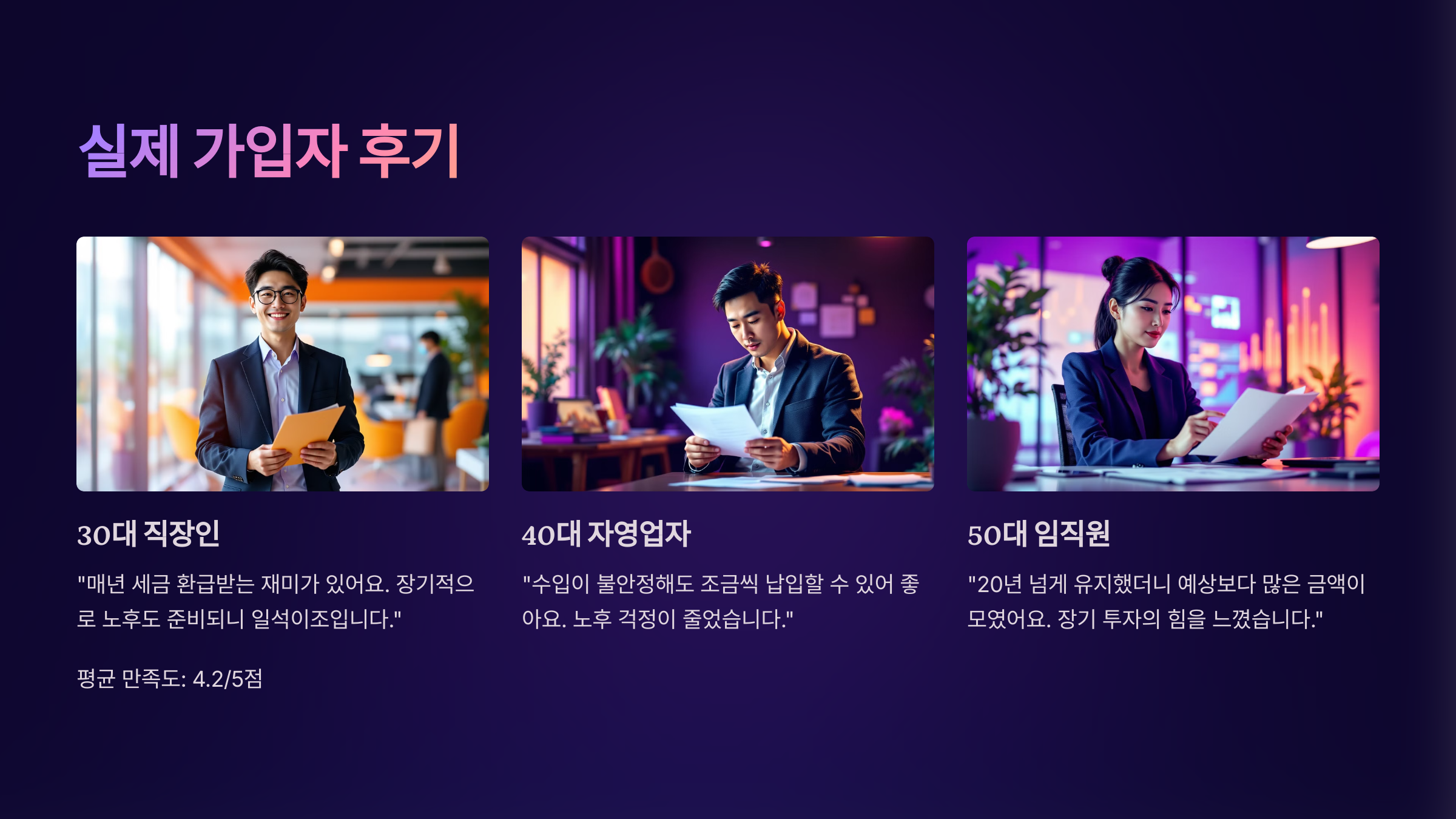 실제로 연금저축보험에 가입한 사람들은 어떤 생각을 가지고 있을까요? 각기 다른 이유와 목적, 상황 속에서 선택한 사람들의 이야기를 들어보면, 상품의 진짜 가치가 보인답니다 😊