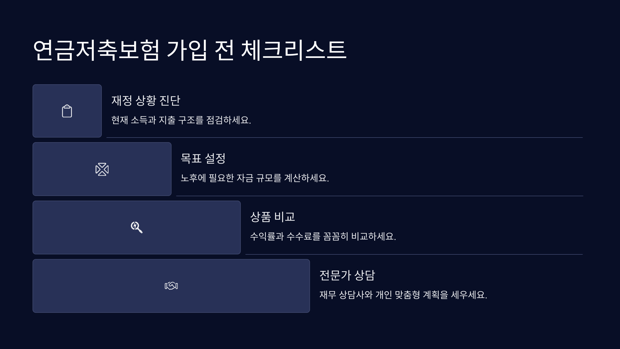 ① 내가 납입 가능한 금액은 얼마인지 계산해보기 ② 보험사의 수수료, 사업비 구조 확인하기 ③ 수익률 시뮬레이션으로 최종 수령액 확인하기 ④ 중도 해지 조건 및 해지환급률 비교하기