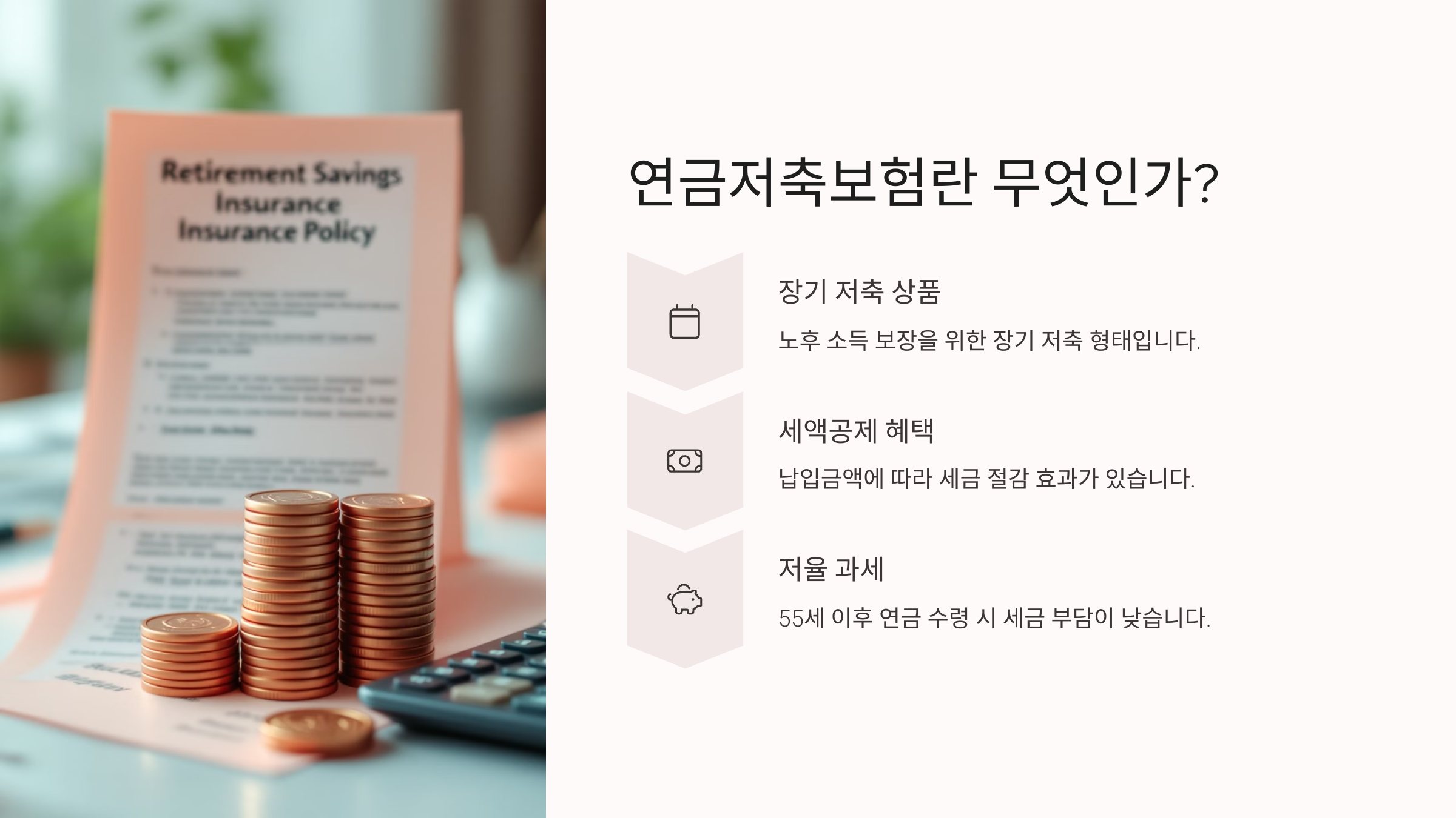 연금저축보험은 말 그대로 노후를 대비하기 위해 정기적으로 납입한 돈을 보험사에서 굴려 연금 형태로 돌려받는 상품이에요. 가장 큰 특징은 일정 기간 납입 후, 일정 나이부터 매달 연금처럼 받을 수 있다는 점이에요. 특히 연금저축 '펀드'와는 다르게 보험사의 안정적인 자산운용이 기본이라 원금 손실 걱정이 덜하죠.