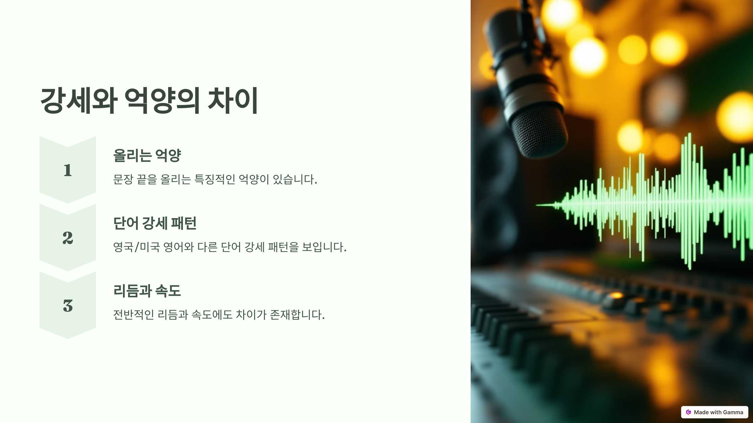 2. 강세가 문장 전체에 고르게 분포됨 미국식 영어에서는 중요한 단어에 강세를 두고 나머지는 빠르게 발음하는 경향이 있어요. 하지만 아이리쉬 영어는 모든 단어를 비교적 또박또박 읽는 느낌을 줘요. 이 때문에 속도가 빠르거나 리듬이 일정하지 않으면 이해하기 어려울 수 있어요.