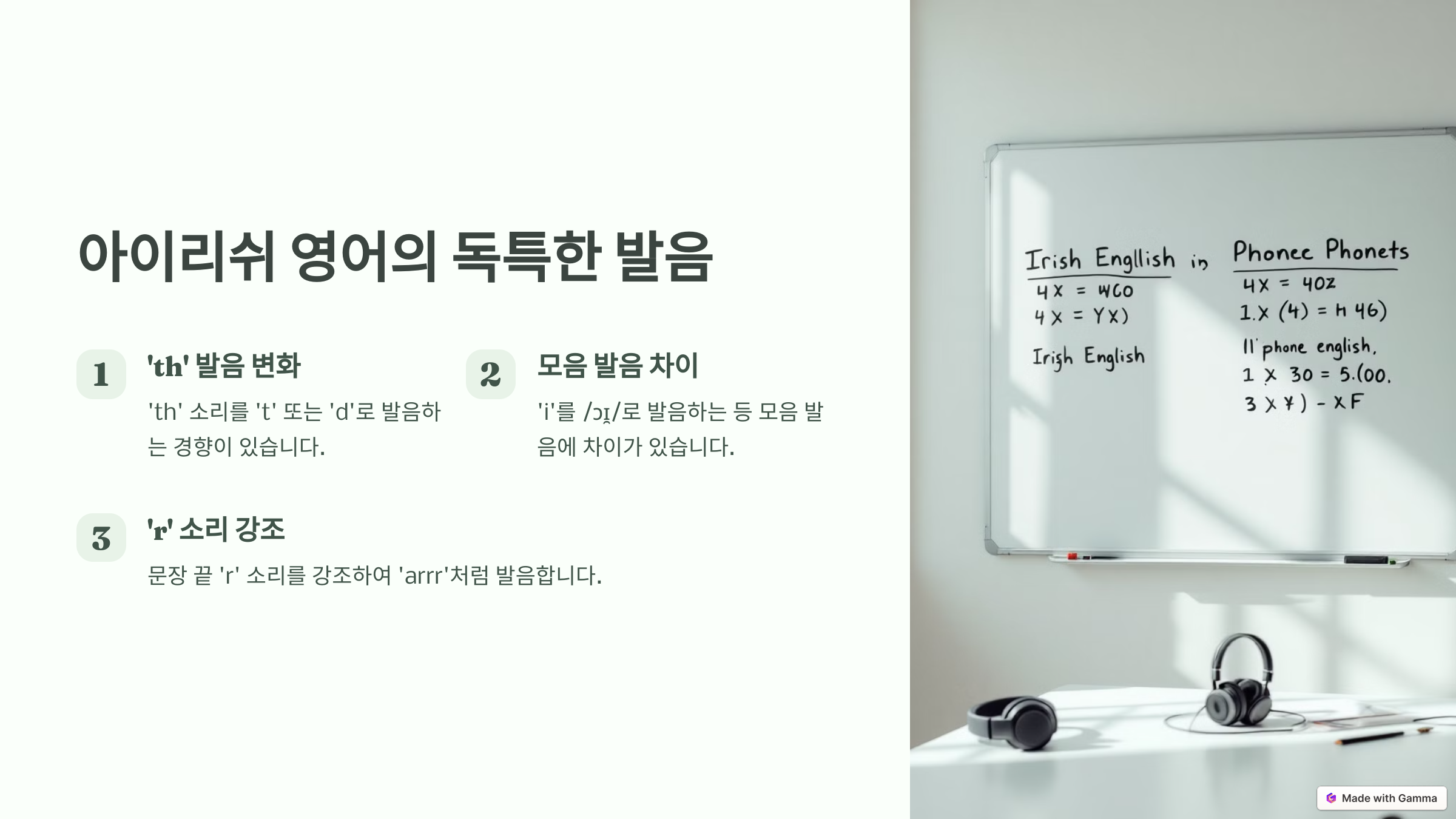 아이리쉬 영어의 독특한 발음 아이리쉬 영어의 가장 큰 특징 중 하나는 **독특한 발음**이에요. 다른 영어권 지역과 비교했을 때 몇 가지 두드러지는 차이점이 있어요.