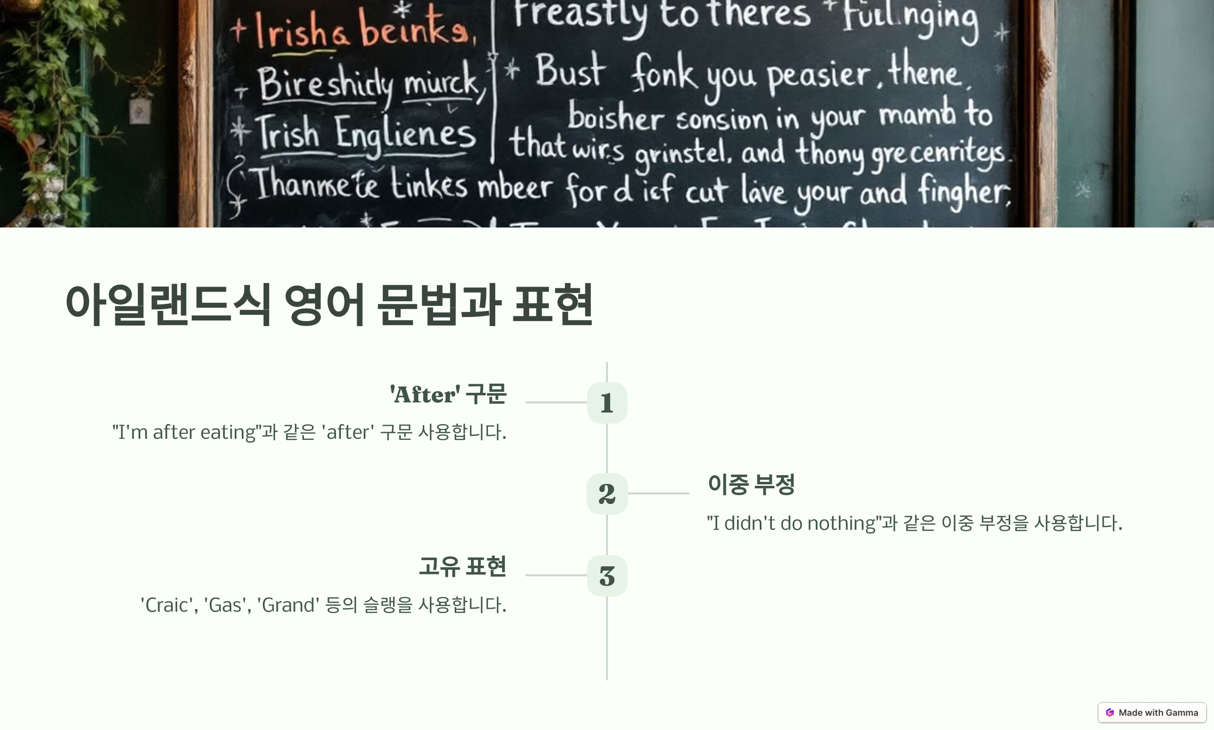 아일랜드식 영어 문법과 표현 아이리쉬 영어는 일반적인 영어와 문법적으로 조금 다른 특징이 있어요. 특히, 아일랜드어(게일어)의 영향을 받아서 독특한 문장 구조와 표현을 사용하기도 해요. 😲