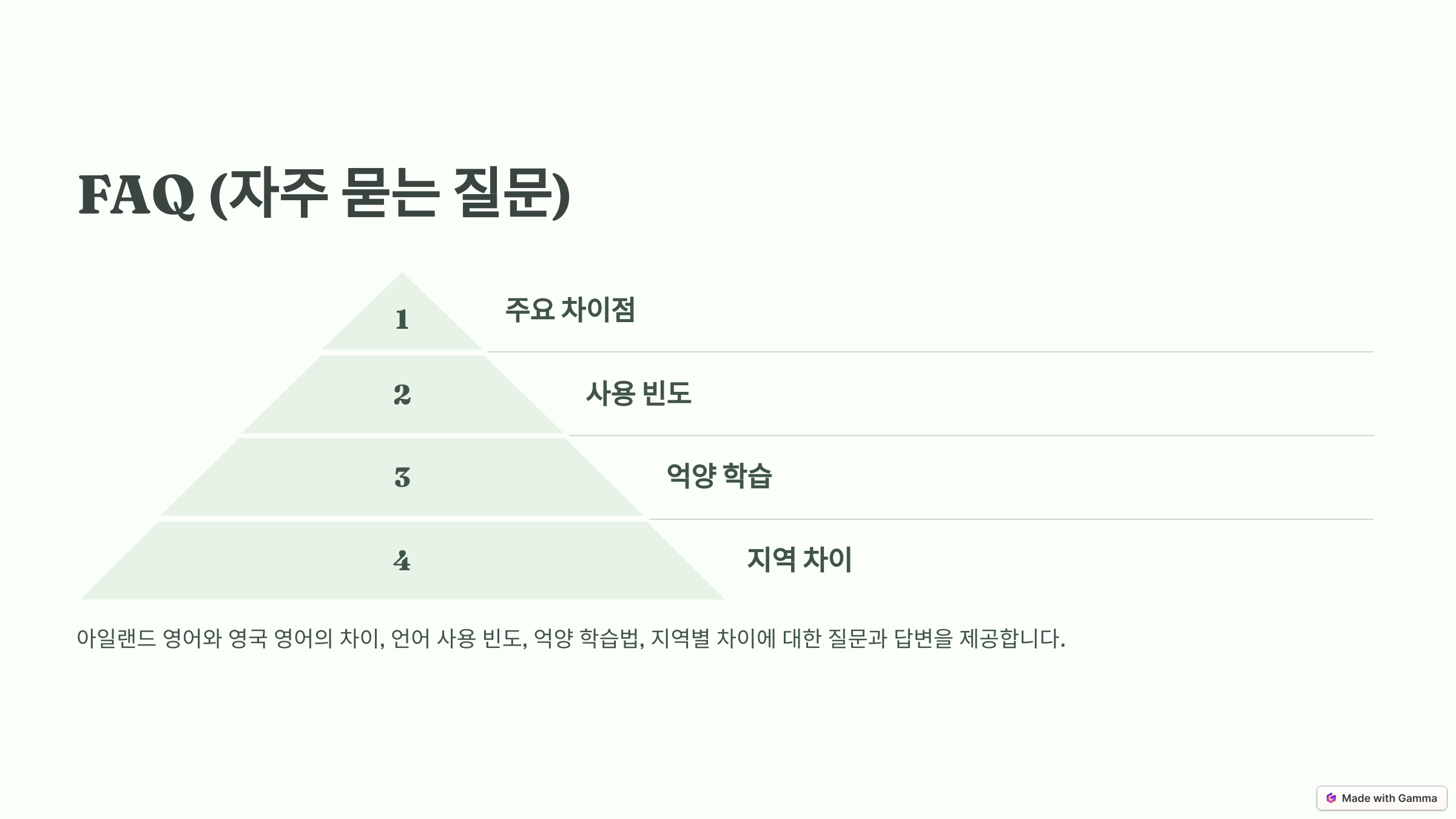 팁 설명 🎧 많이 듣기 아이리쉬 영어가 나오는 영화, 유튜브, 팟캐스트 듣기 📖 표현 익히기 아일랜드에서 자주 쓰이는 표현과 숙어 공부 🗣 억양 연습 문장 끝을 살짝 올리면서 말하기 📺 아일랜드 배우 인터뷰 보기 Cillian Murphy, Saoirse Ronan 같은 배우 인터뷰 시청 이제 아이리쉬 영어도 조금 친숙하게 느껴지죠? 😄 다음으로, 사람들이 많이 궁금해하는 질문들을 정리한 **FAQ**를 볼까요? 📌👇