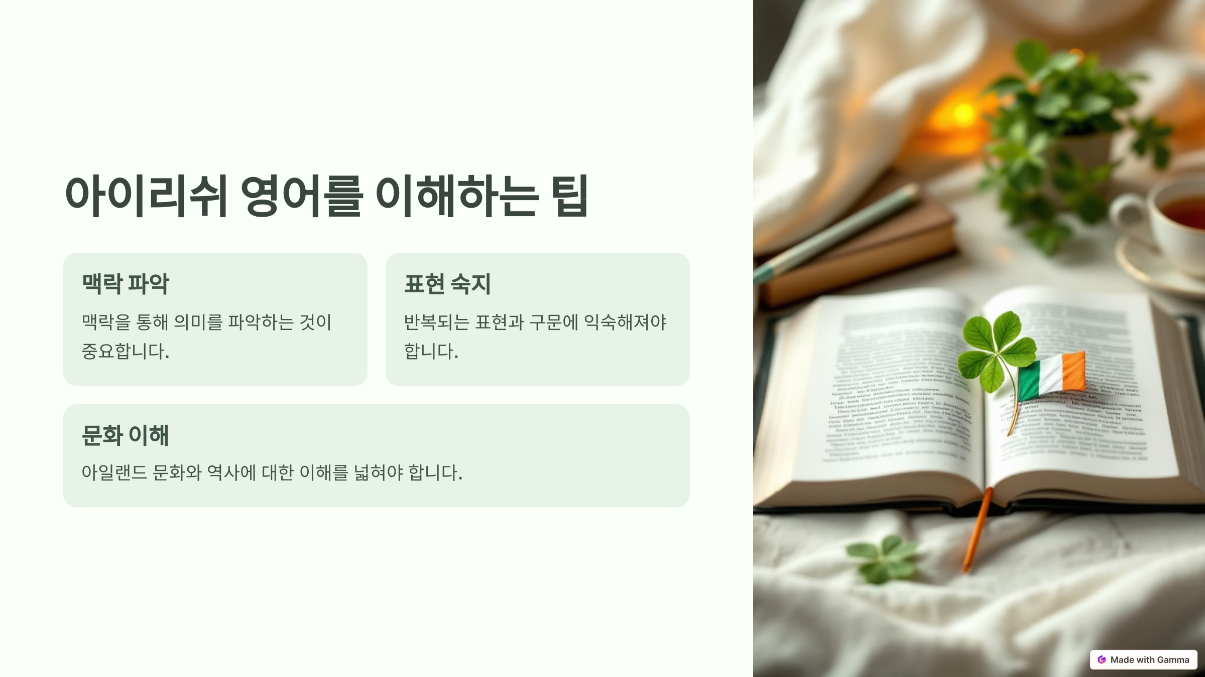 아이리쉬 영어를 이해하는 팁 아이리쉬 영어가 어렵게 느껴진다면 걱정하지 마세요! 몇 가지 팁을 알면 훨씬 쉽게 이해할 수 있답니다. 😉