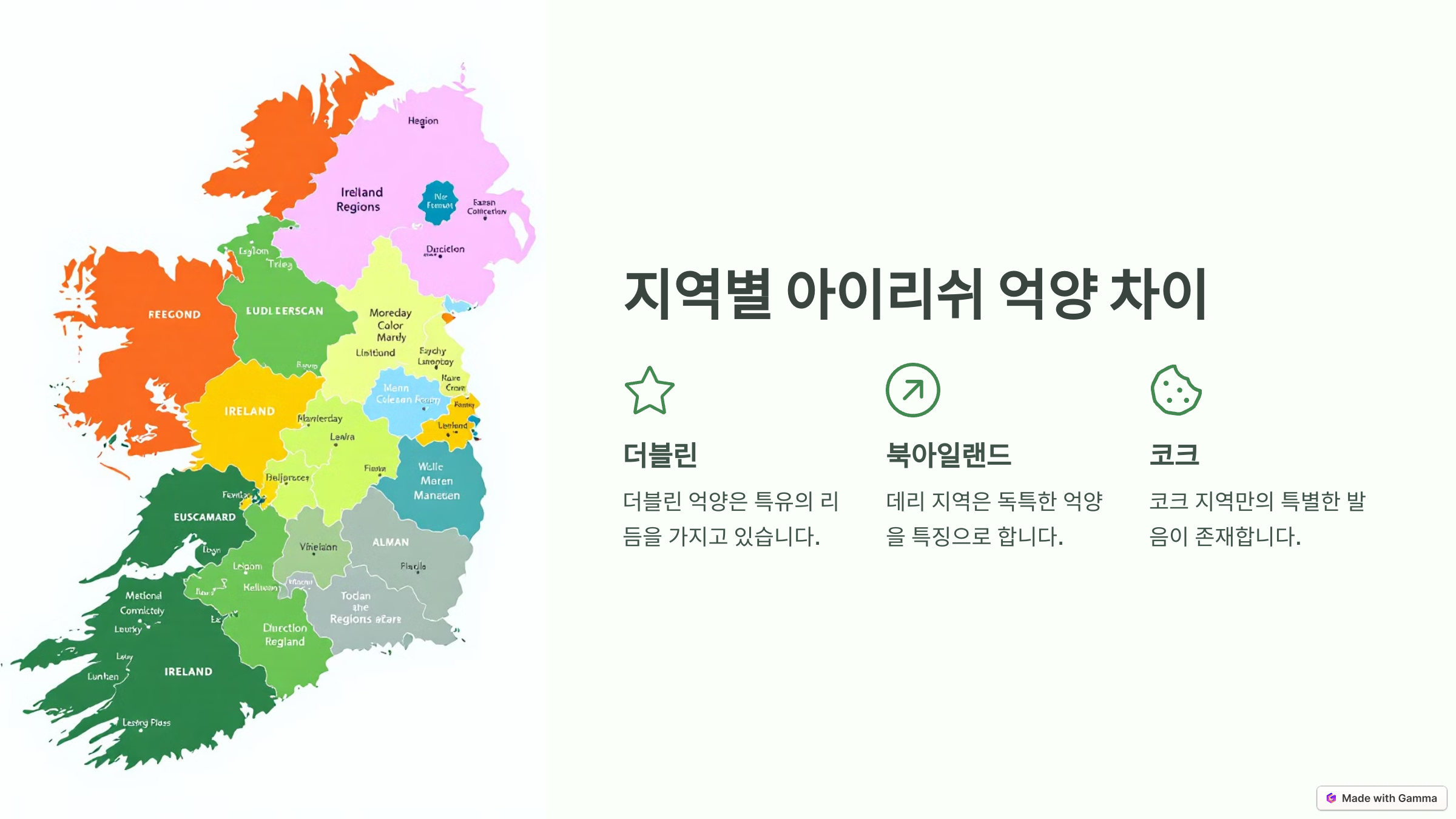 지역별 아이리쉬 억양 차이 아일랜드는 작은 나라지만 지역마다 영어 억양이 꽤 달라요. 같은 아일랜드인끼리도 특정 지역의 억양을 이해하기 어려울 때가 있죠! 😲