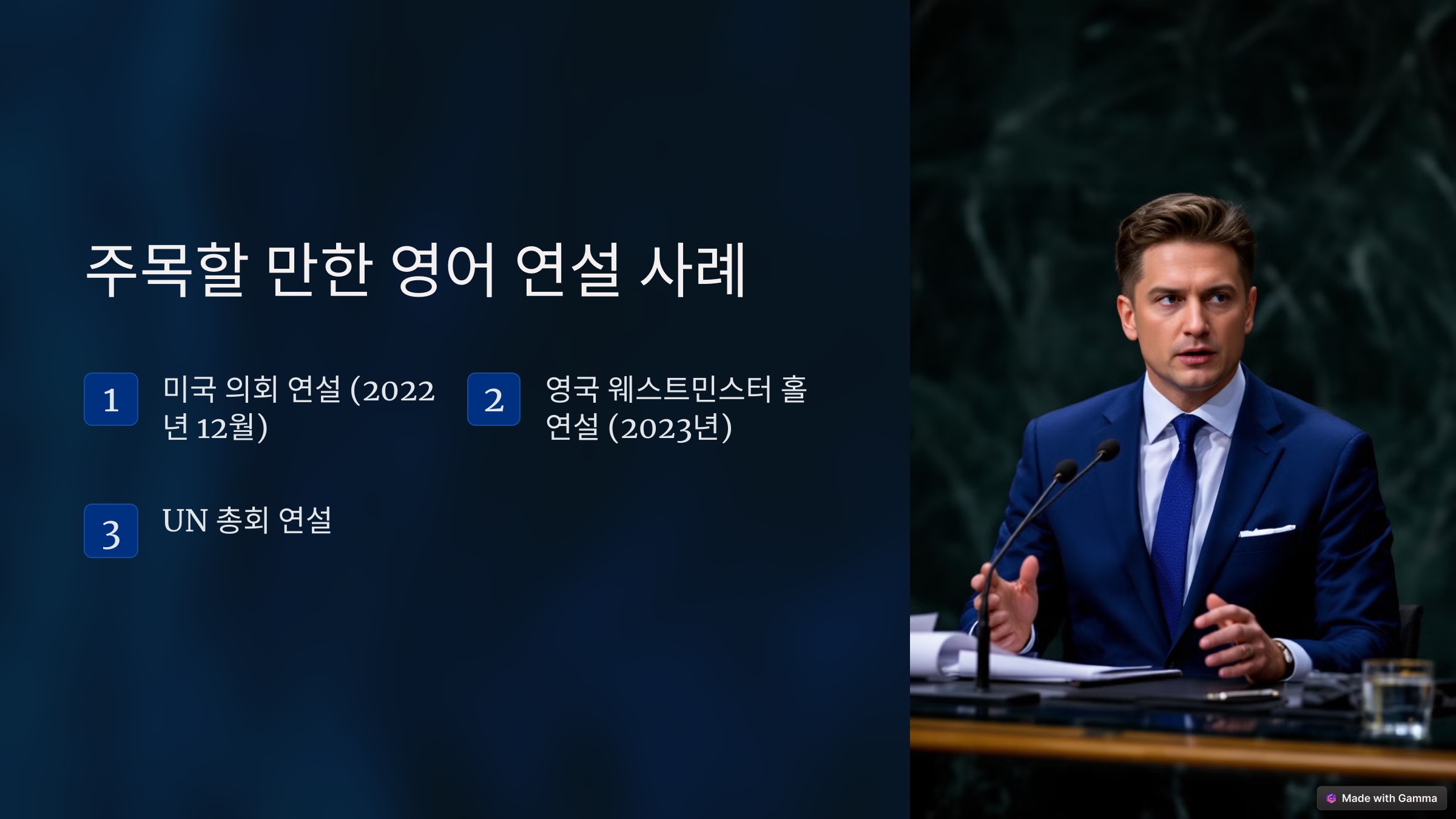 특히 러시아-우크라이나 전쟁 이후 그는 세계 여러 나라의 국민과 직접 소통하며 강력한 리더십을 보여줬어요. 이 과정에서 영어 연설과 인터뷰를 적극 활용했기 때문에, 영어 실력 자체보다는 그의 전달력과 진정성이 더욱 강조되었어요. 🎤