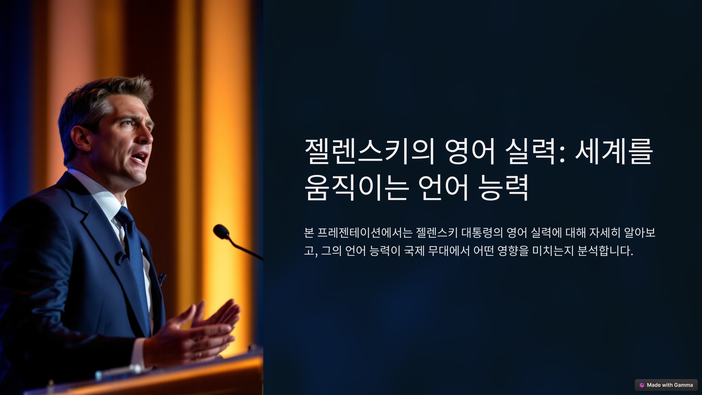 젤렌스키 대통령의 영어 실력은 중급 수준이지만, 강한 전달력과 감성적인 연설로 국제 사회에서 큰 영향을 미치고 있어요. 영어가 완벽하지 않더라도, 중요한 것은 어떻게 효과적으로 소통하느냐라는 점을 그가 잘 보여주고 있어요. 🎤