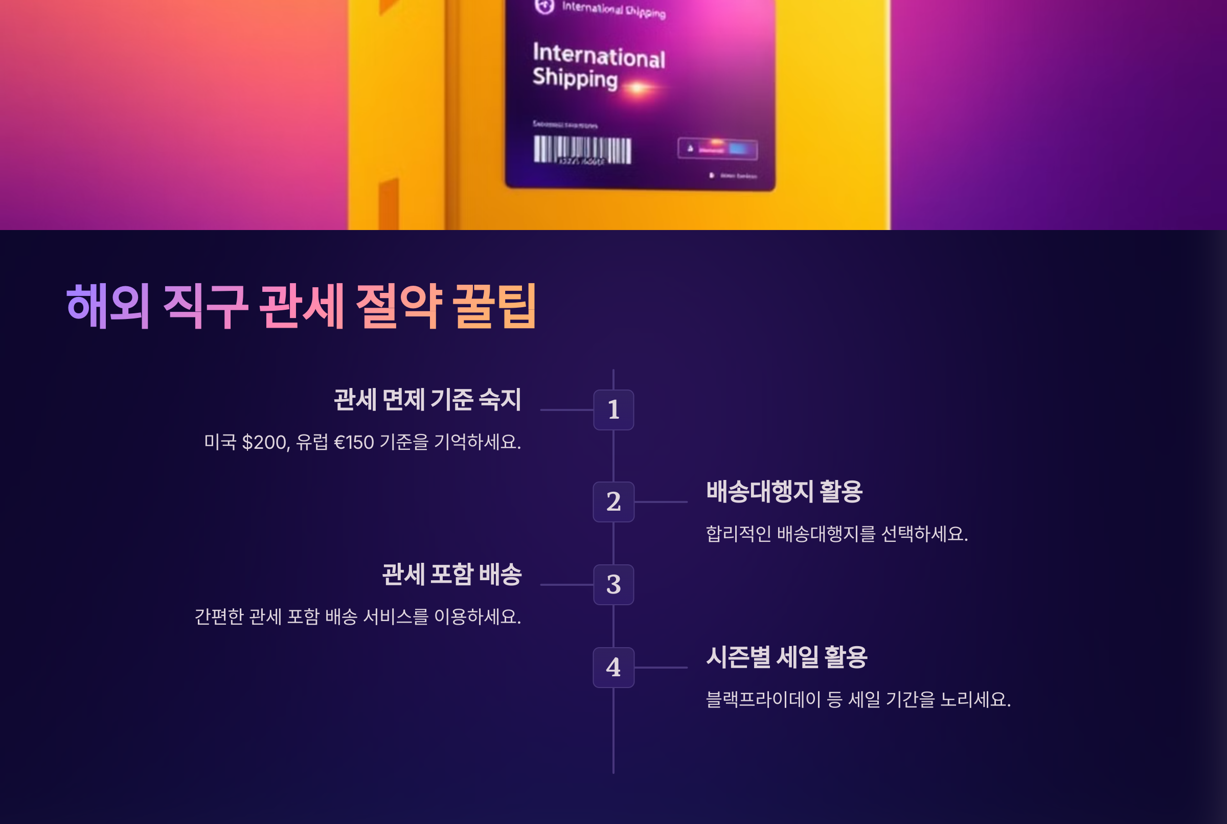 해외 직구를 할 때 가장 중요한 부분 중 하나가 바로 '관세'인데요. 관세를 절약하려면, 150달러 이하의 제품을 구입하는 것이 가장 좋답니다. 이 가격대의 제품은 면세 혜택을 받을 수 있어요. 🎁
