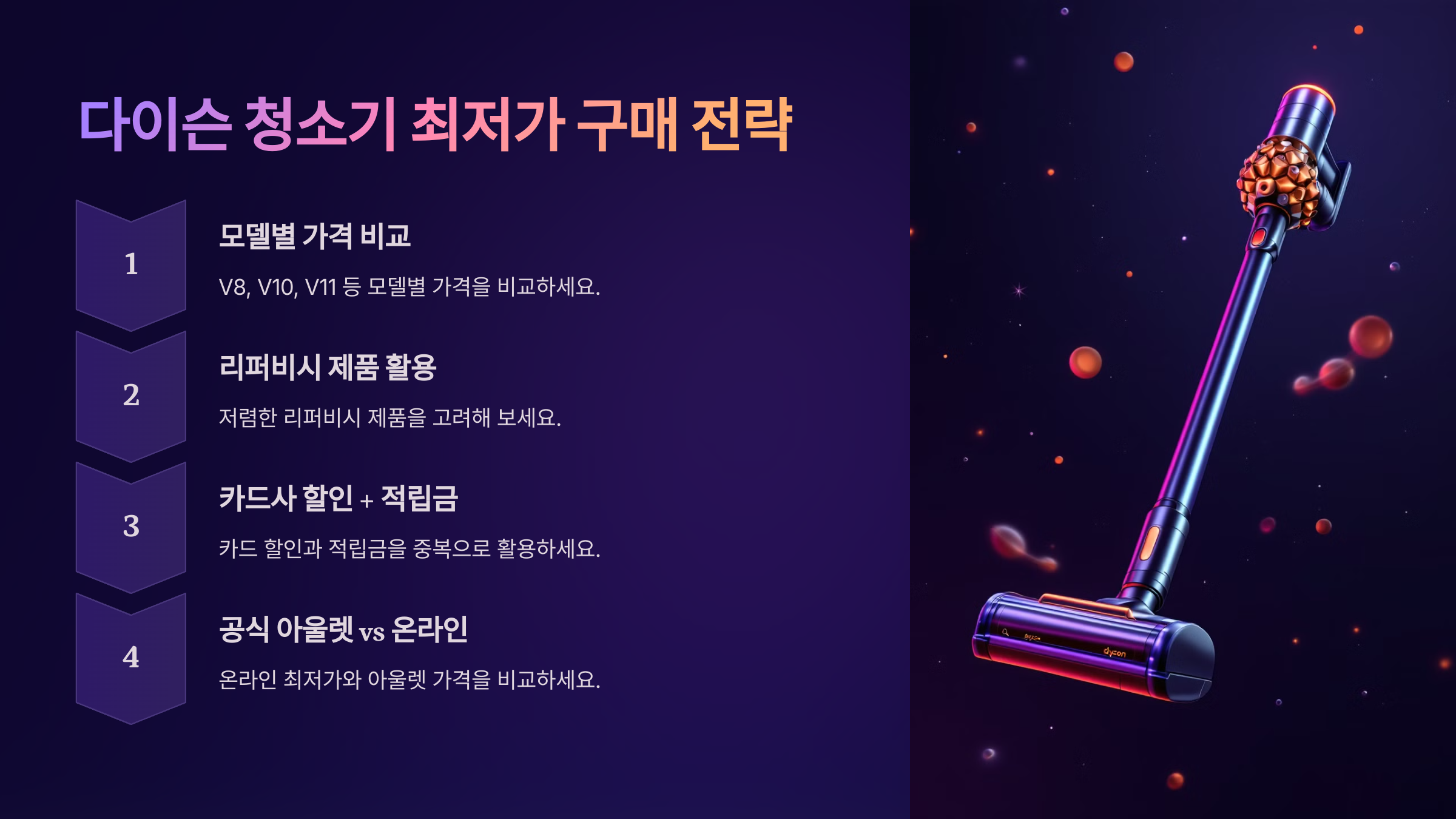 최저가 비교 사이트나 가격 비교 앱을 이용하면 다이슨 청소기의 가장 저렴한 가격을 쉽게 찾을 수 있어요. 여러 쇼핑몰에서 진행하는 할인 프로모션도 잘 활용해야 해요! 💥