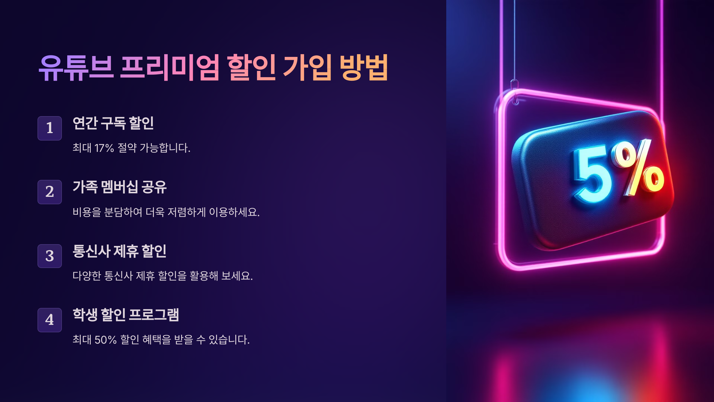 유튜브 프리미엄은 광고 없이 영상을 시청하고, 백그라운드에서 음악을 들을 수 있는 유료 서비스예요. 유튜브 프리미엄의 할인을 받으려면 학생 인증을 하거나 가족 멤버십을 이용하는 방법이 있어요. 학생 인증은 유효한 학교 이메일을 등록하면 되는데, 이 방법은 최대 6개월까지 할인 혜택을 받을 수 있어요. 🎓